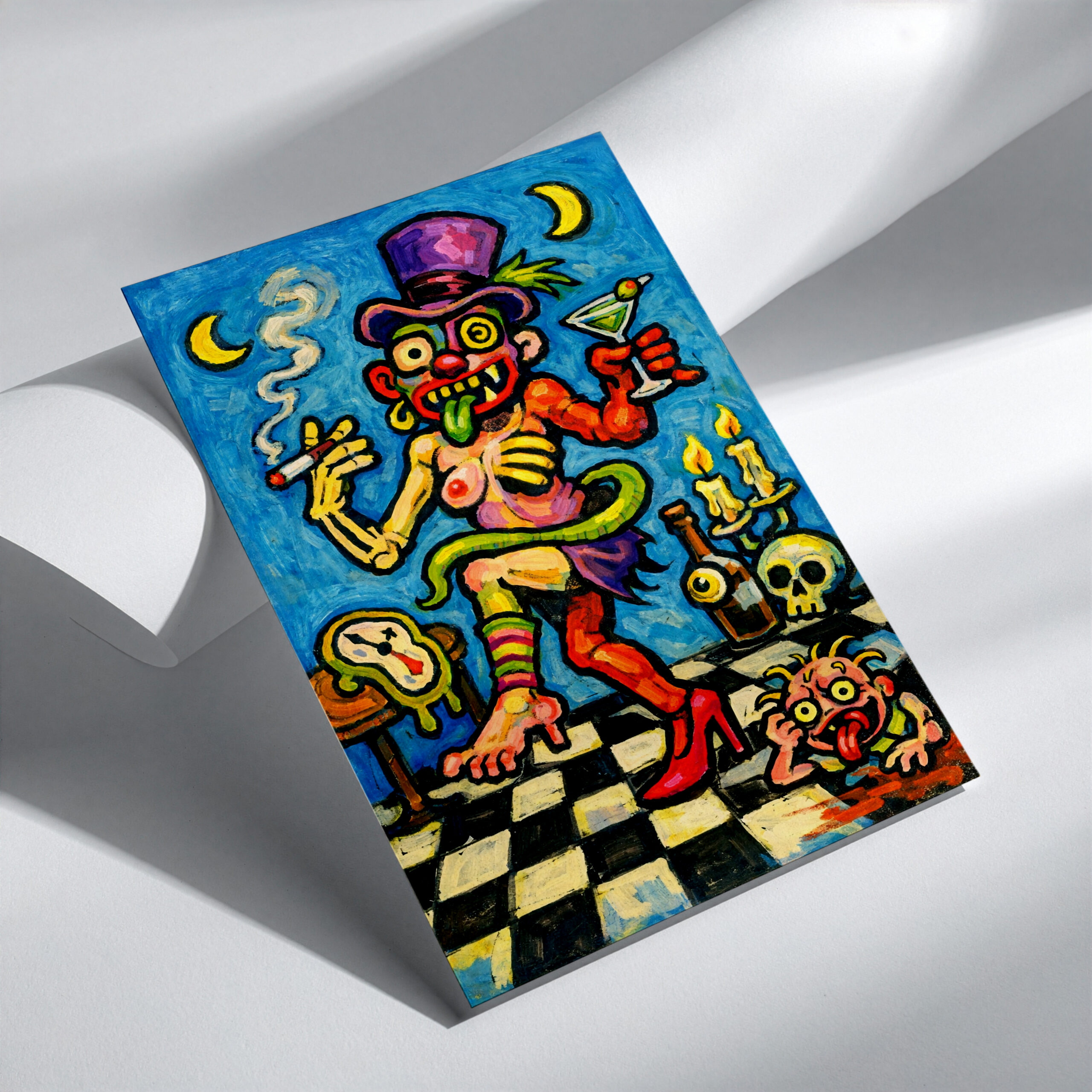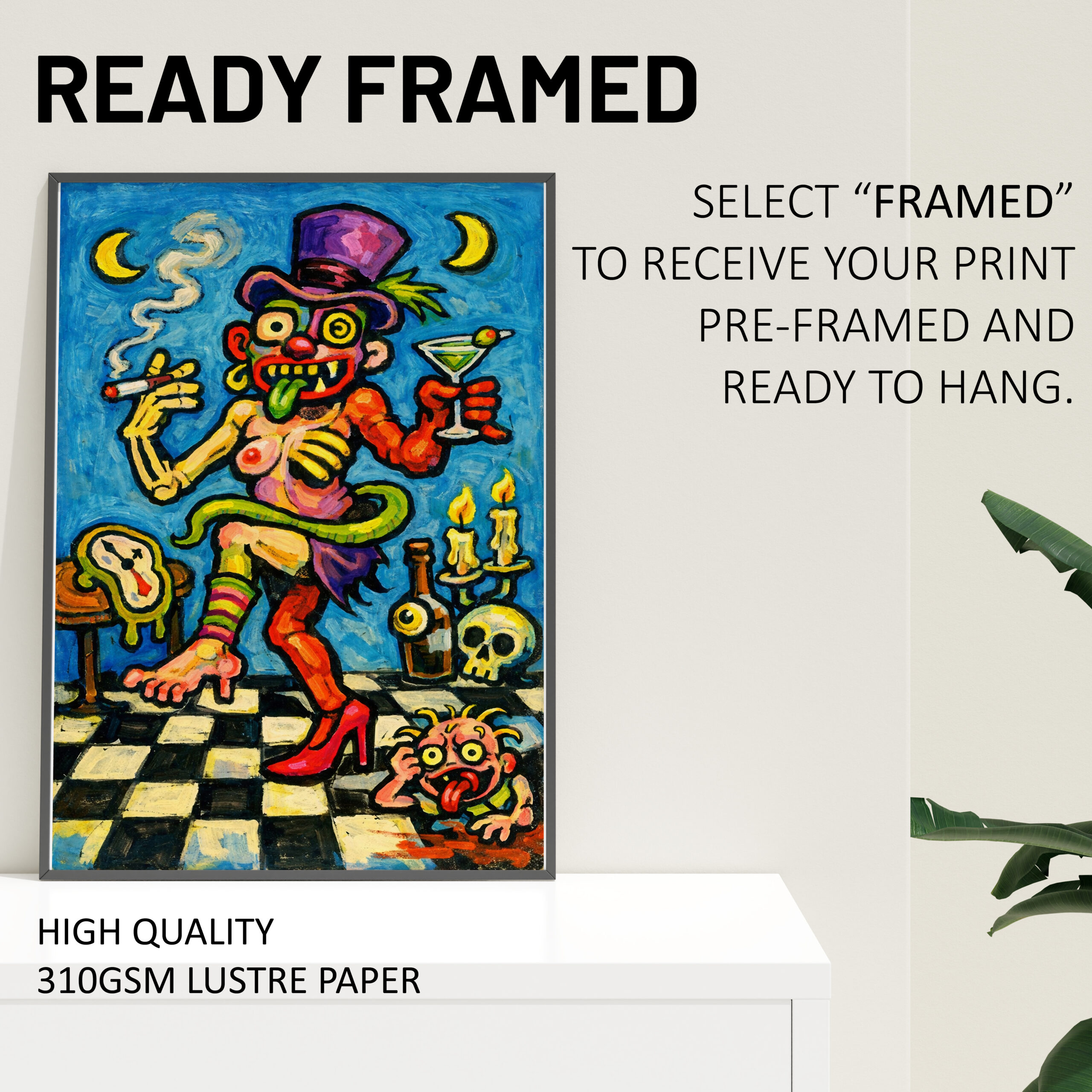 Add chaos, colour, and weird character to your home with this Dancing Monster wall art print. Featuring a surreal creature in heels and a top hat, holding a cocktail and cigarette in a wildly animated pose, this artwork is full of movement, humour, and strange little details that instantly grab attention. The vivid blue background, bold colours, and unfiltered energy make this print a standout piece for anyone who loves wall art that feels loud, playful, and completely unhinged.
