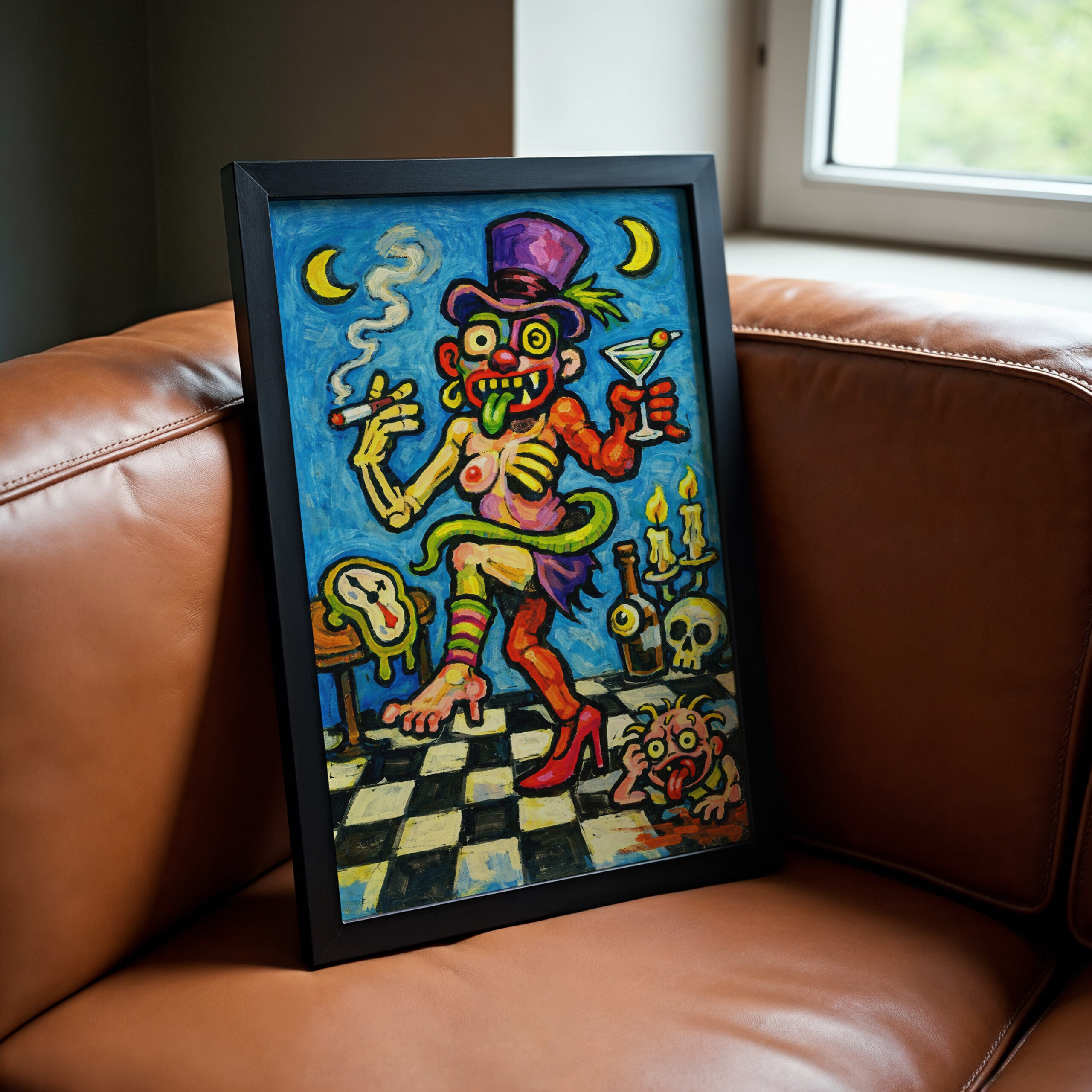 This piece is ideal for anyone who loves surreal wall art, monster posters, quirky character prints, or bold artwork that brings instant personality to a space. It works especially well in home bars, studios, games rooms, offices, bedrooms, or creative interiors where you want something fun, chaotic, and impossible to ignore. The bizarre composition and exaggerated style give the artwork a strong visual presence while keeping it playful and entertaining.