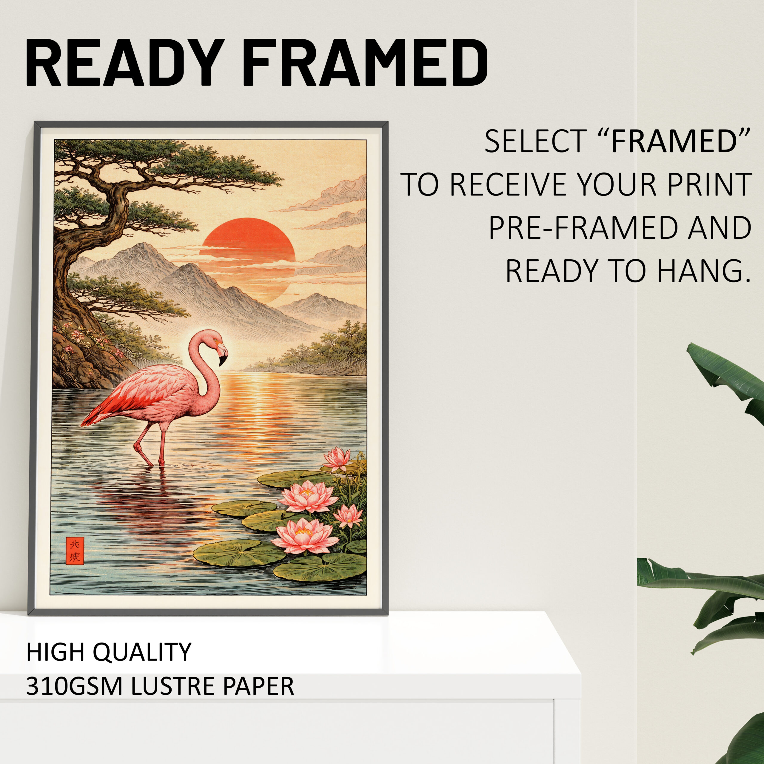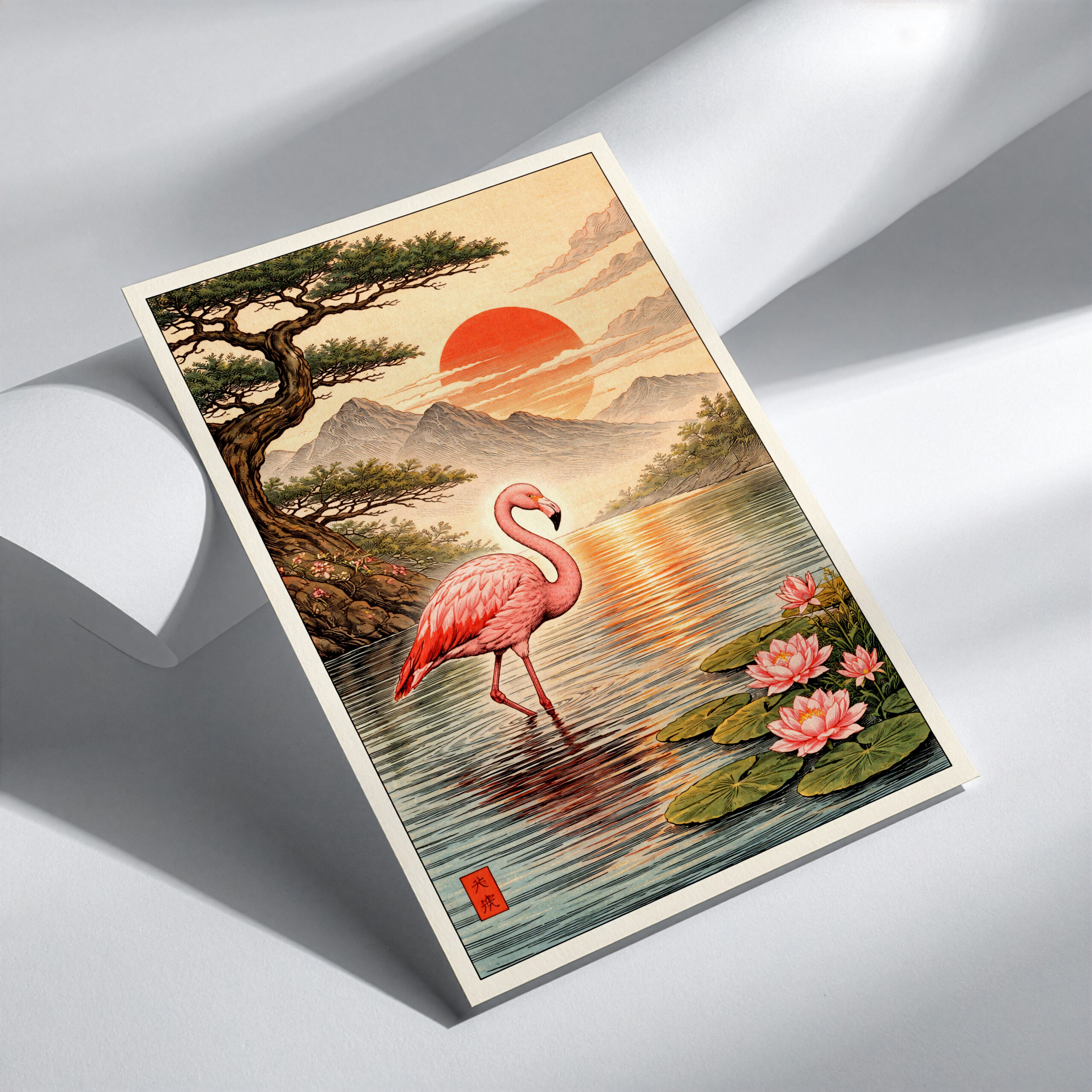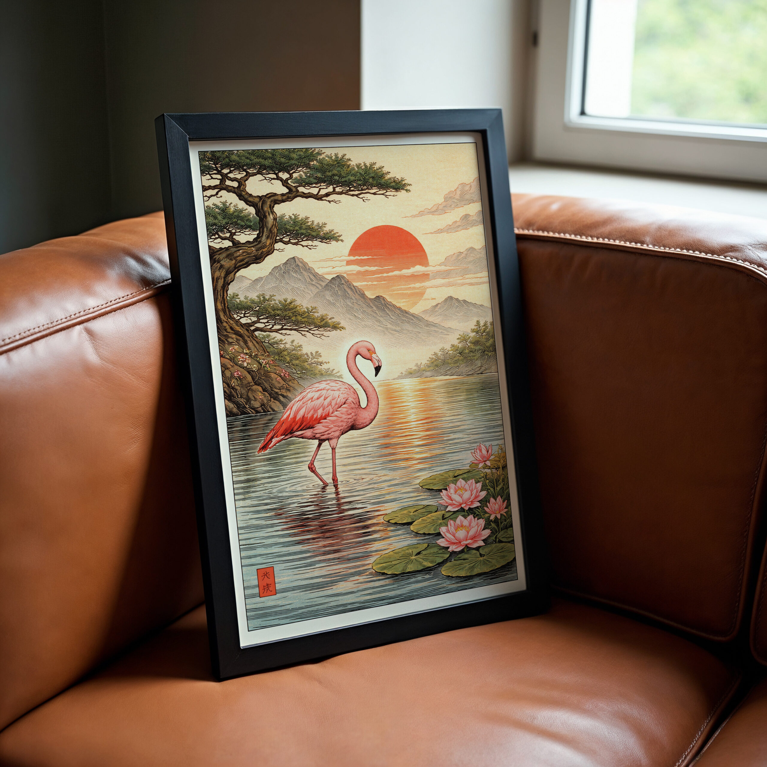 Bring warmth and elegance into your home with this Japanese Flamingo Sunset wall art print. Featuring a graceful pink flamingo standing in calm water against a glowing sunset, this artwork blends nature, soft colour, and Japanese-inspired styling to create a peaceful but eye-catching statement piece.