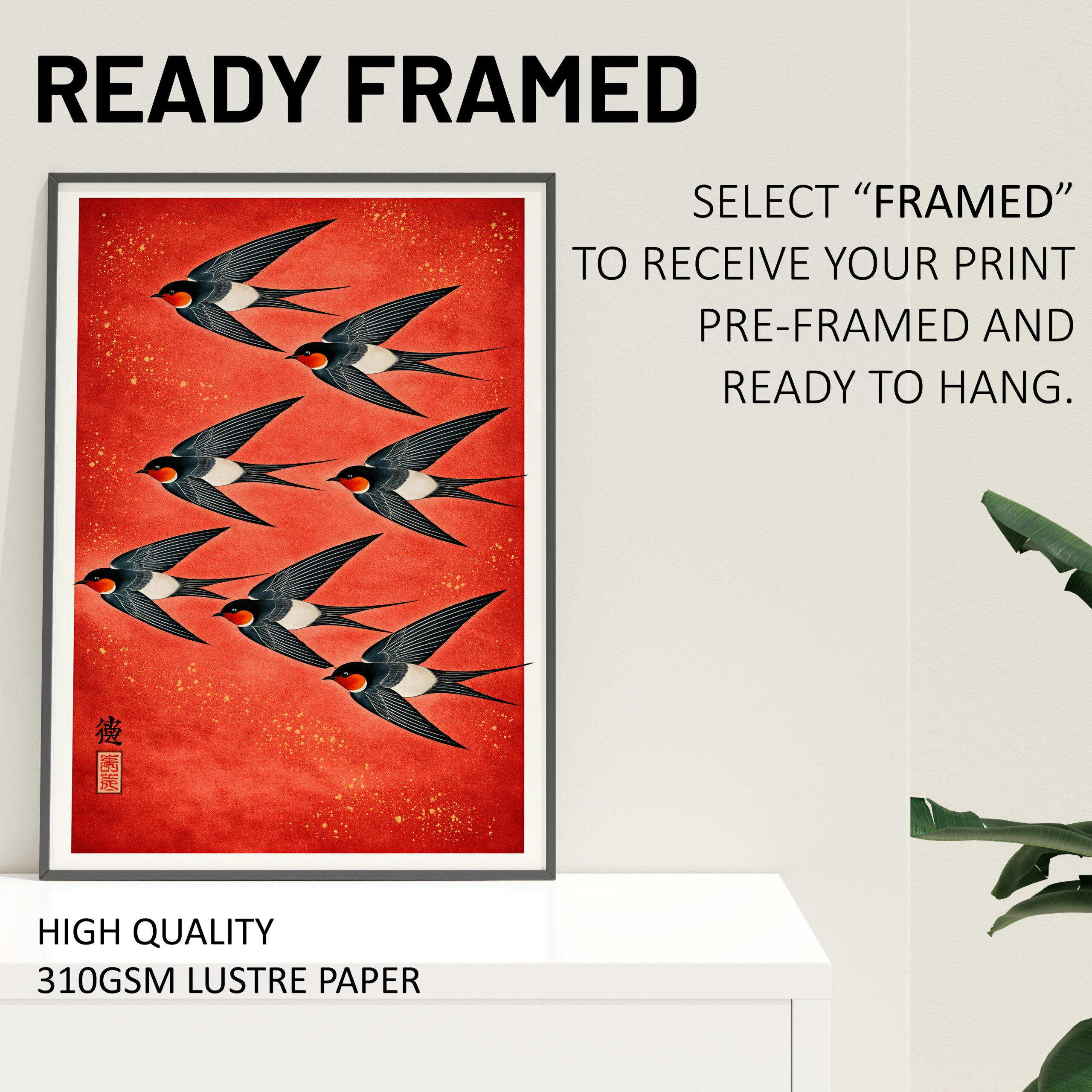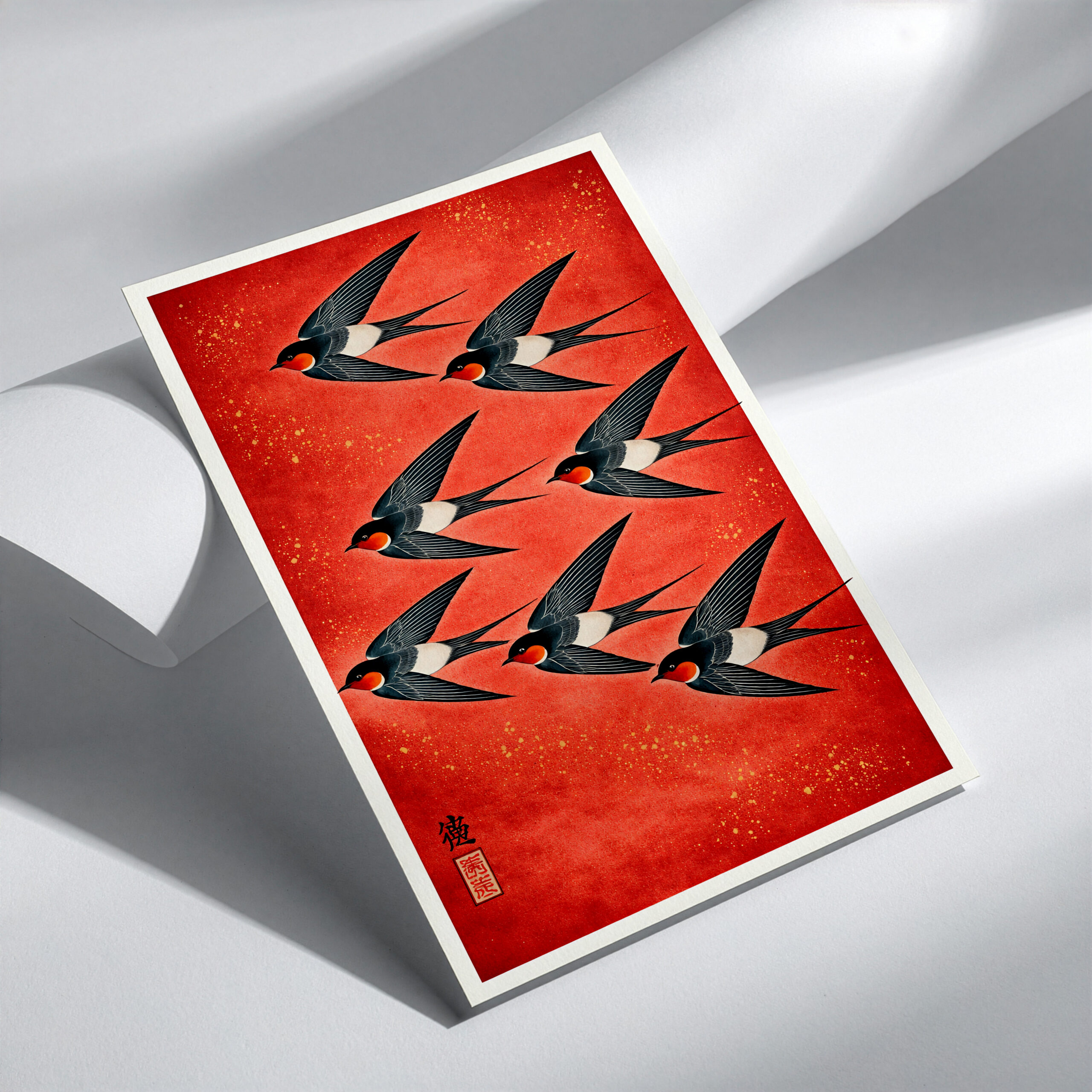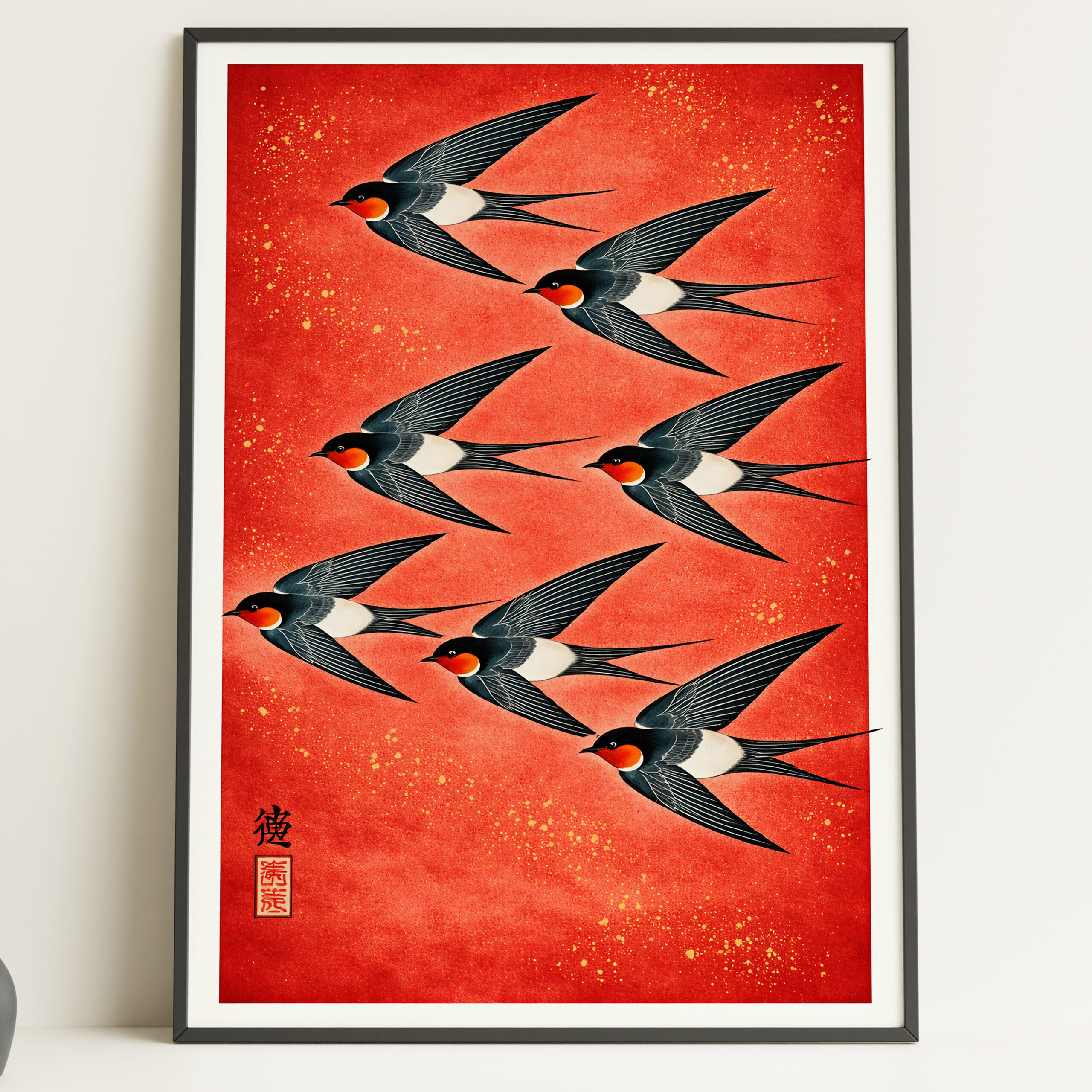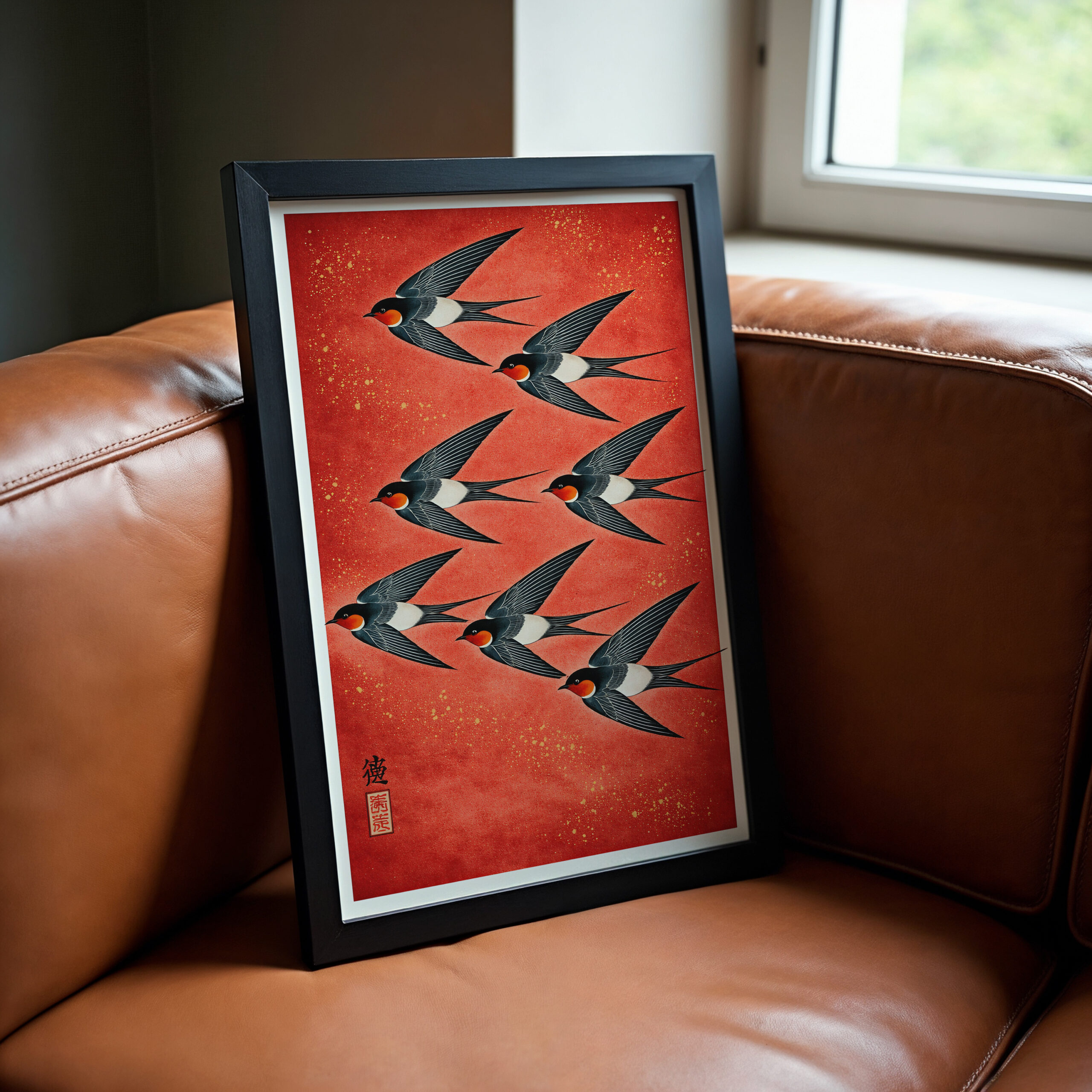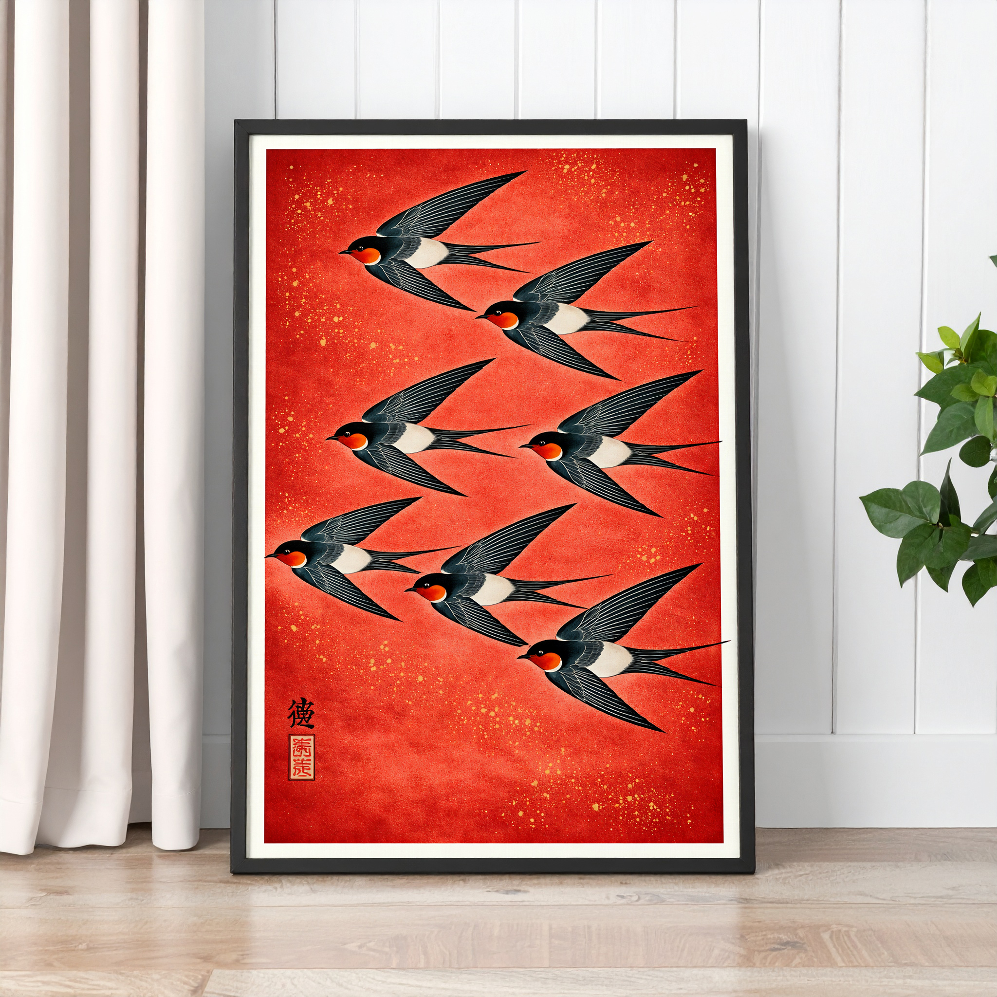 Japanese-style swallow birds wall art print featuring a bold red sky and graceful movement. A striking nature poster for living rooms, bedrooms, hallways, or office decor