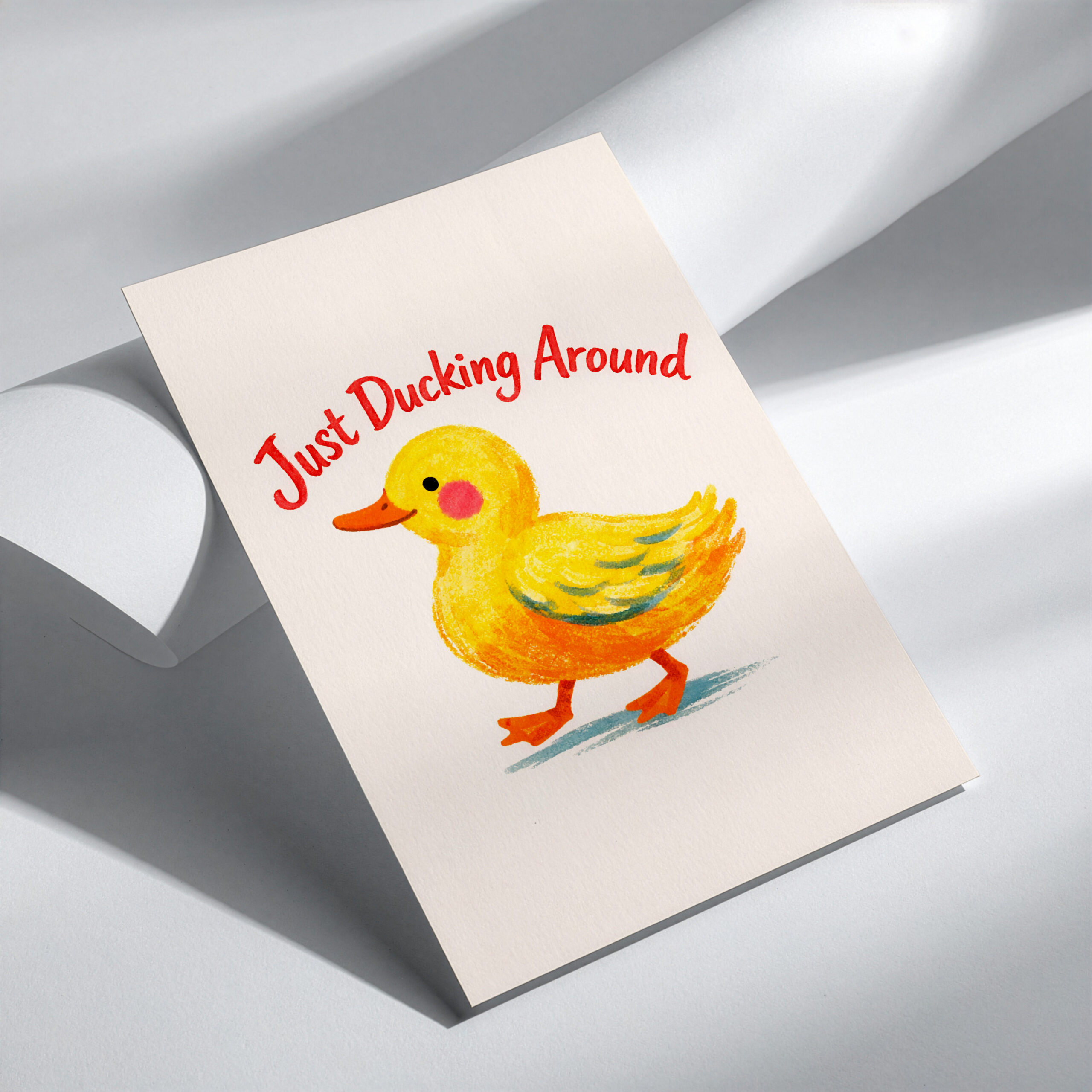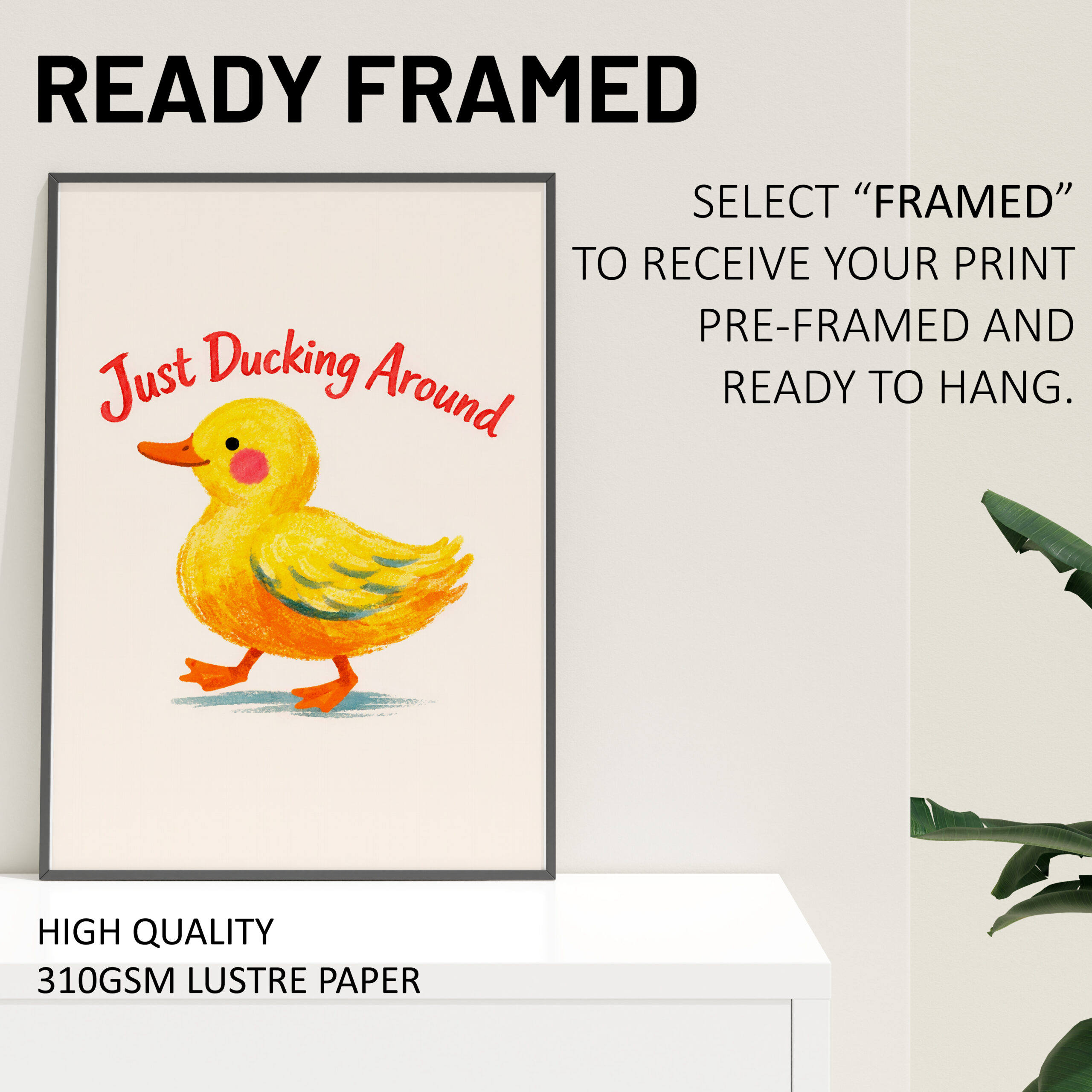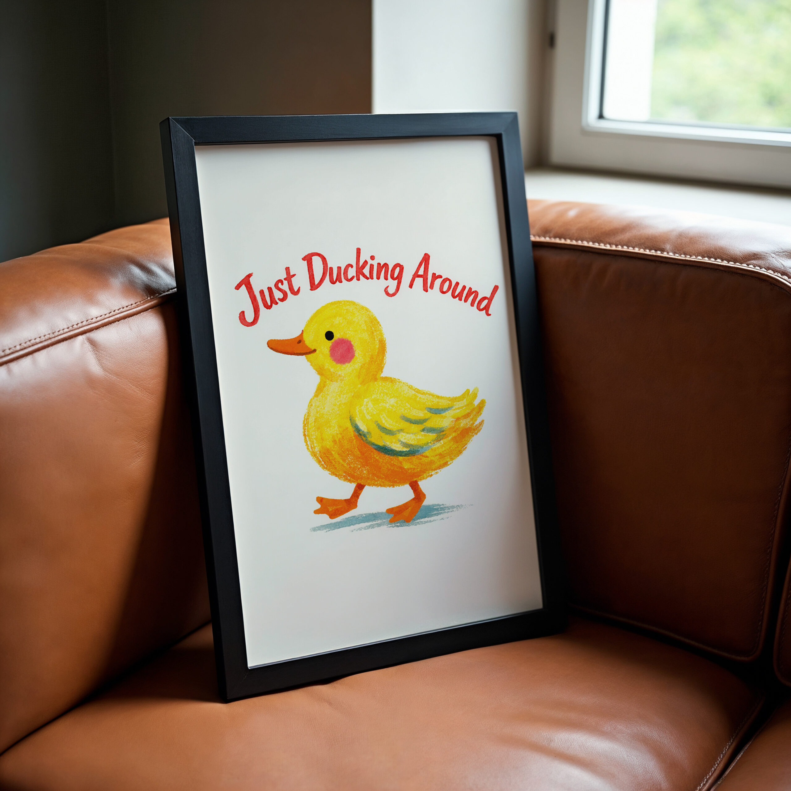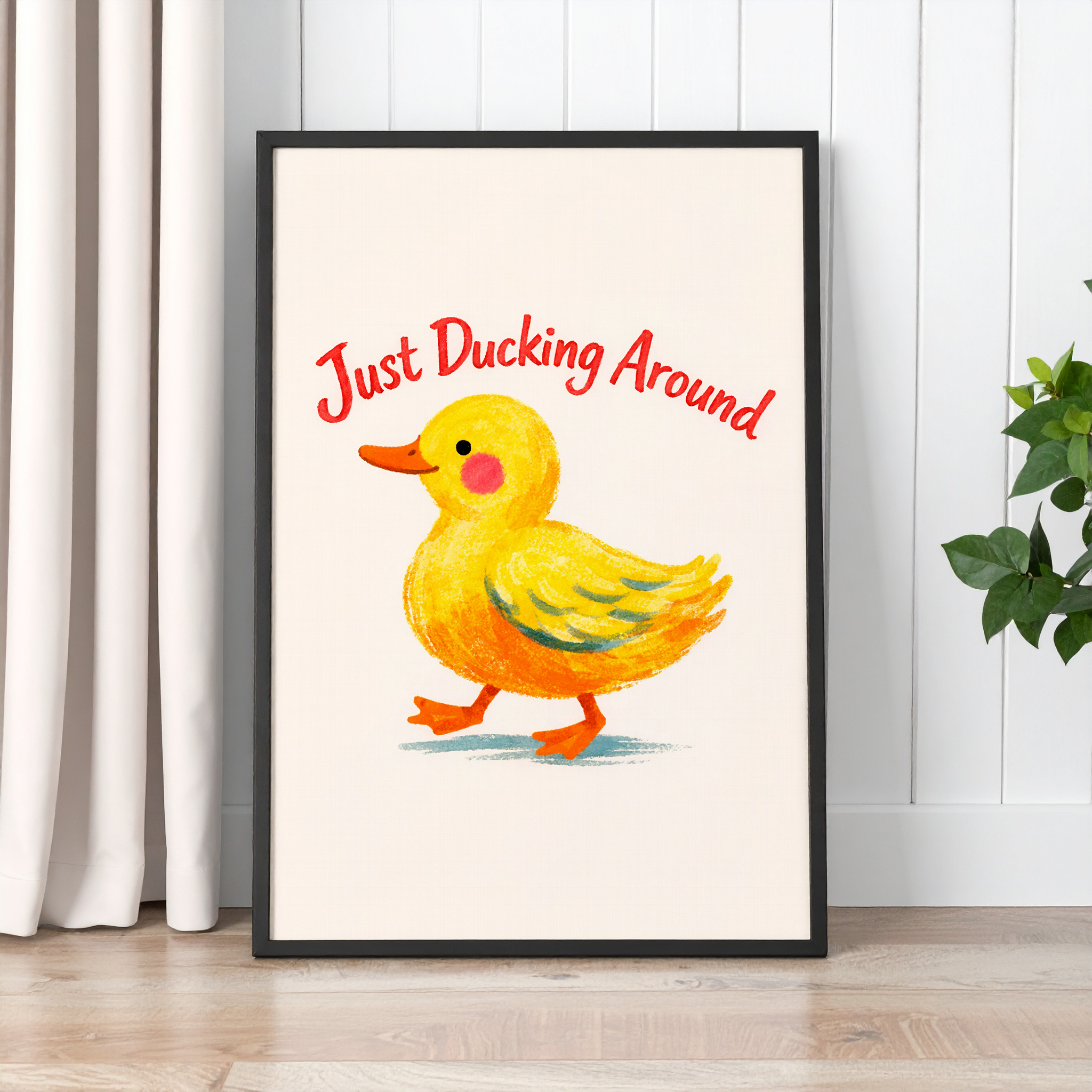 Add a playful touch to your home with this Just Ducking Around wall art print. Featuring a cheerful yellow duck and a bold curved slogan, this artwork has a light-hearted feel that makes it perfect for bright, fun interiors. The simple design, warm colours, and humorous phrase give it a charming look that works well in both modern and more playful spaces.