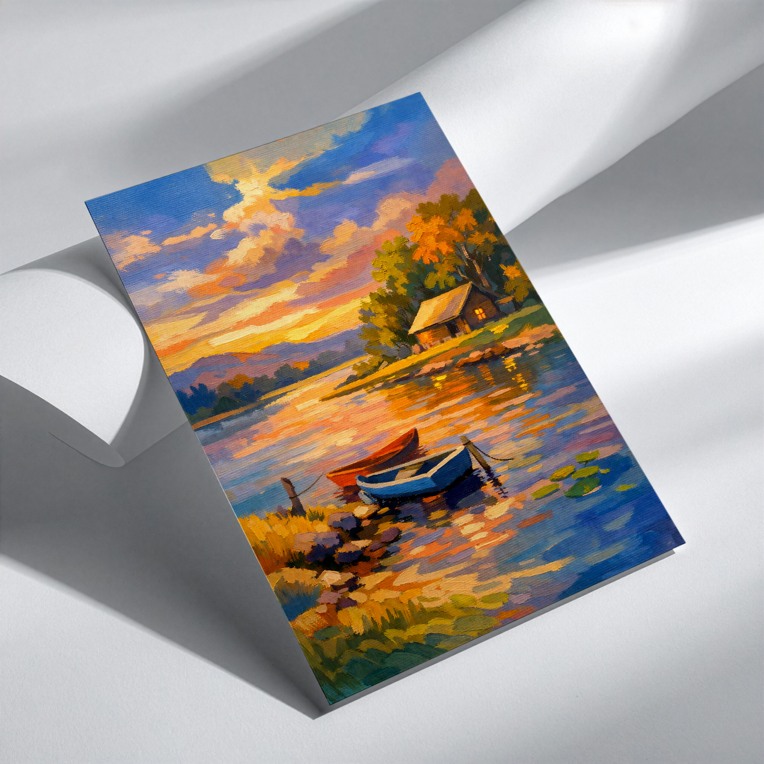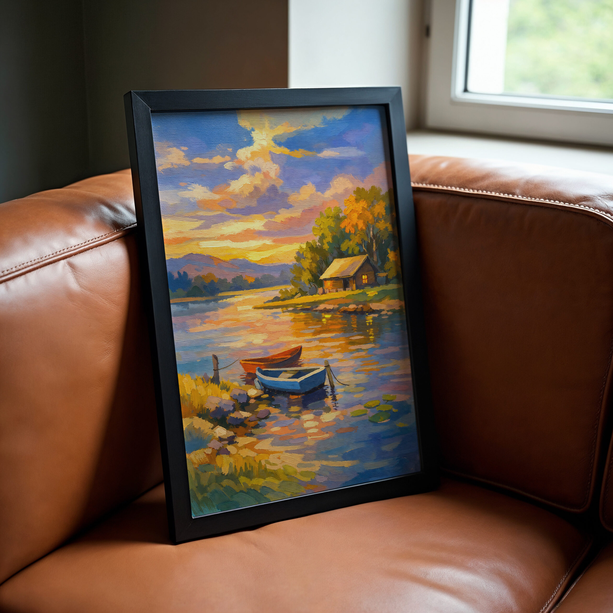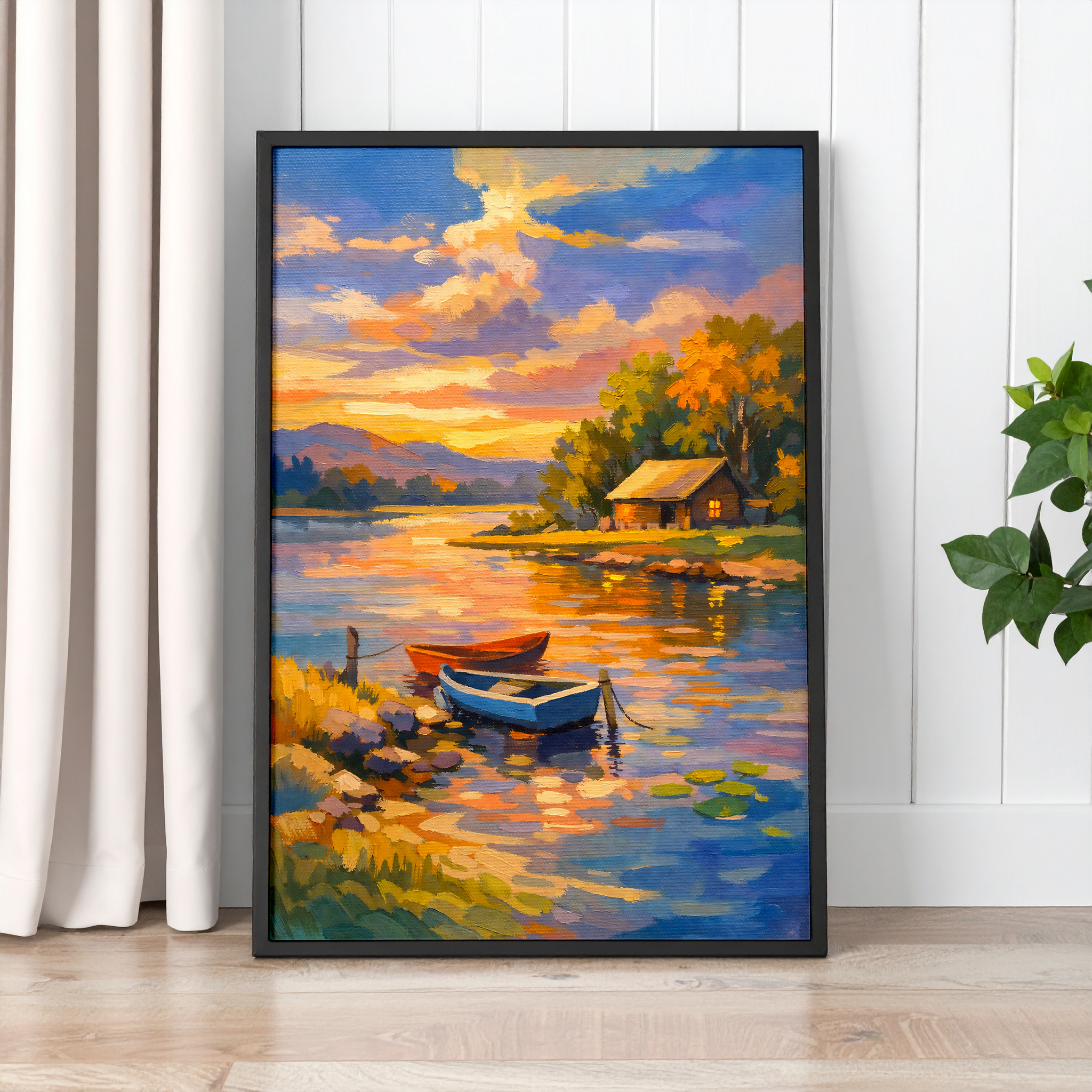 Bring warmth and peaceful colour into your home with this Lakeside Cottage wall art print. Featuring a calm lakeside scene with a small boat in the foreground, a glowing sunset sky, and a cosy cottage resting by the water, this artwork captures the quiet beauty of an evening landscape. The rich reflections, soft painterly style, and golden tones make it a welcoming decorative piece that adds warmth and character to any room.
