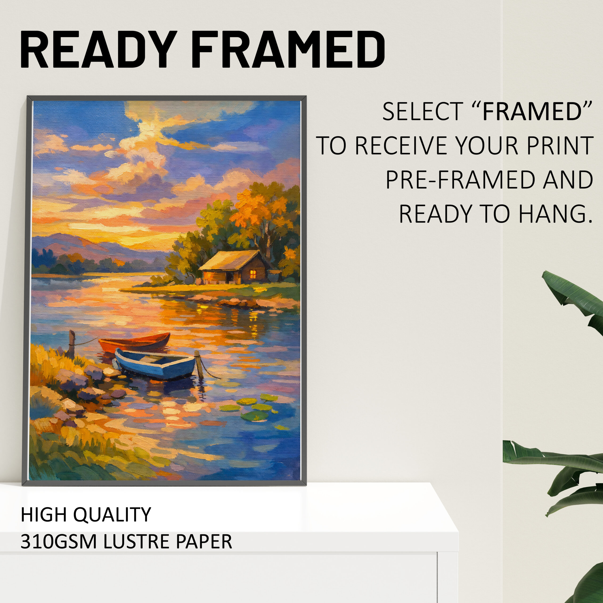 Landscape wall art print featuring a calm lake, small boat, cosy cottage, and warm sunset sky. A peaceful poster for bedrooms, living rooms, hallways, or office decor.