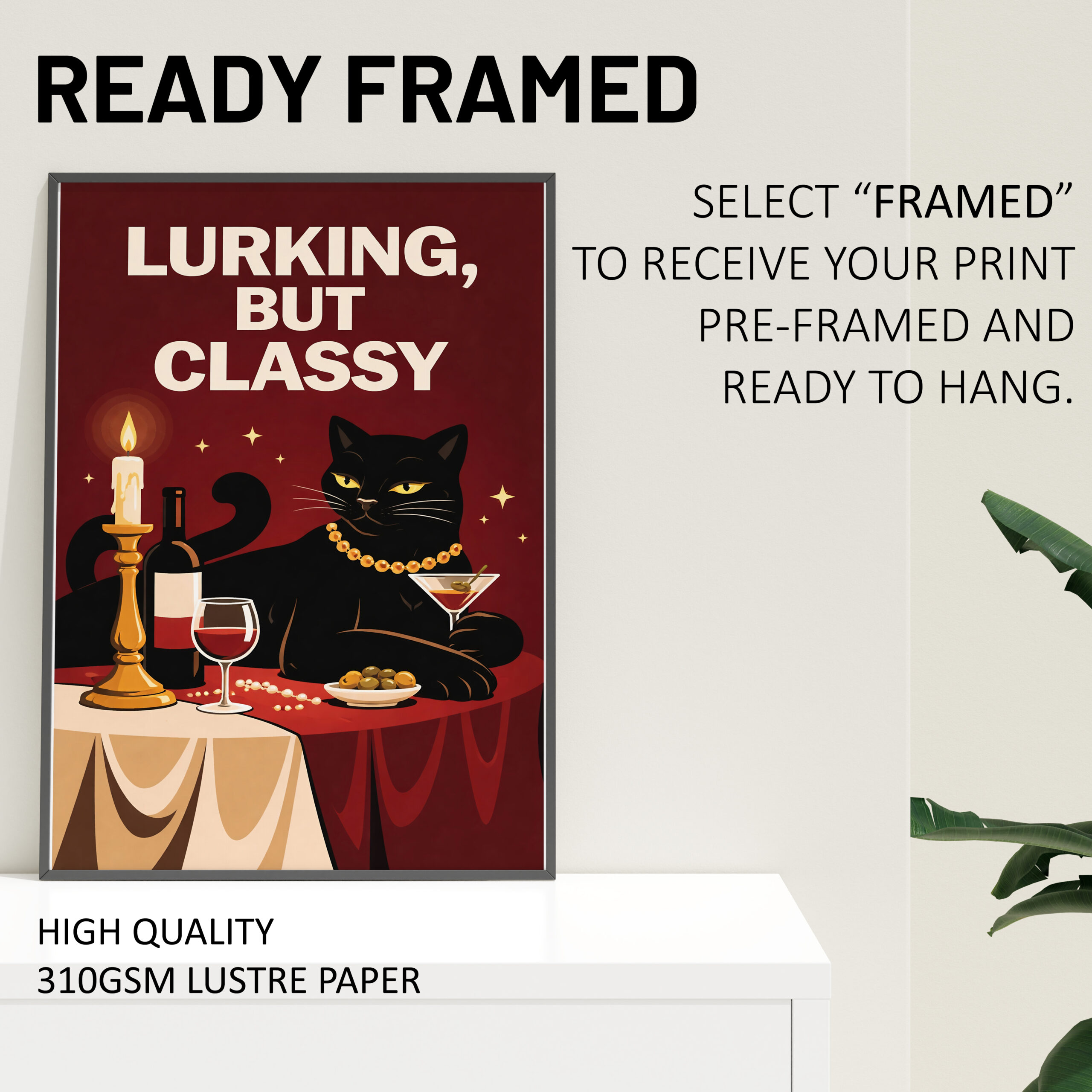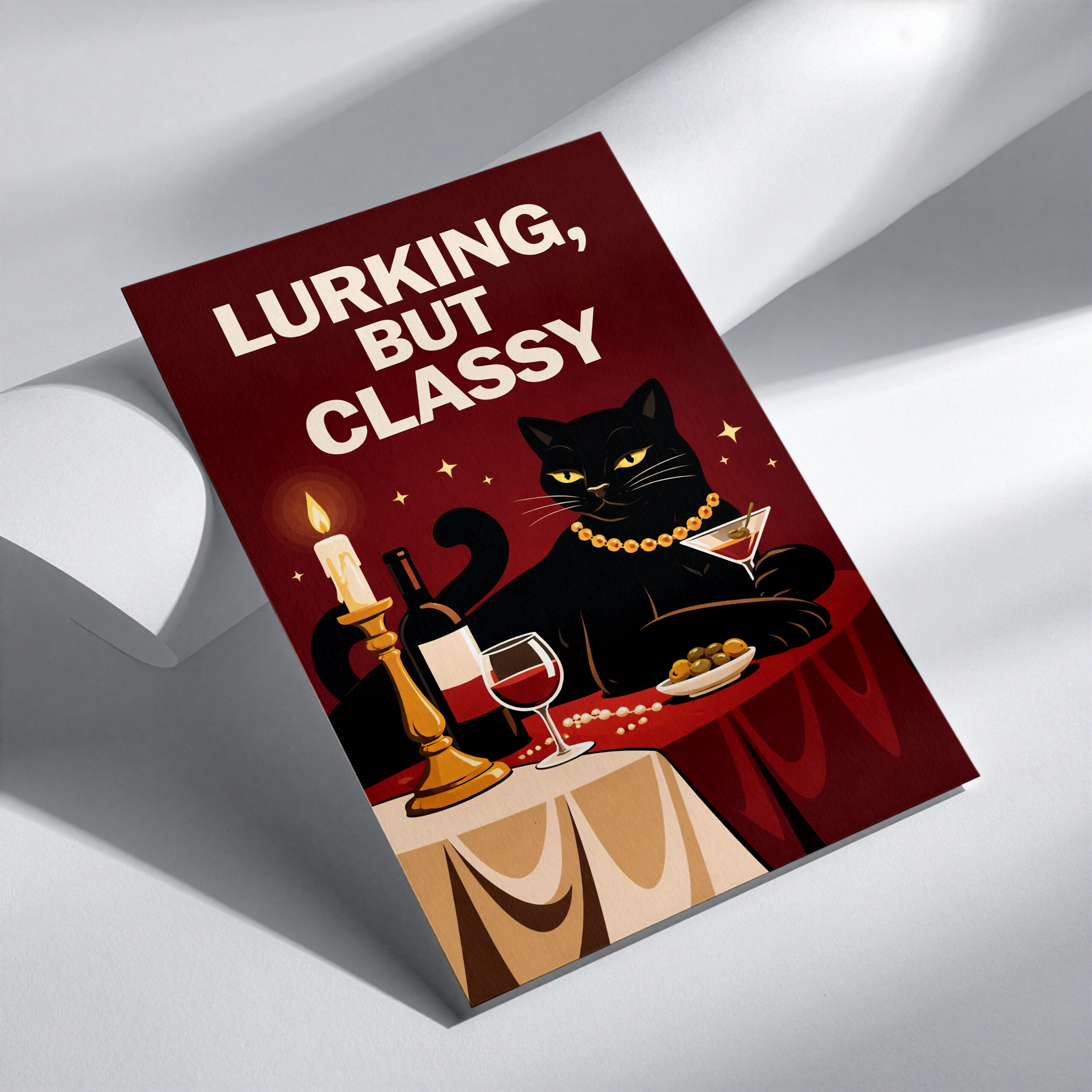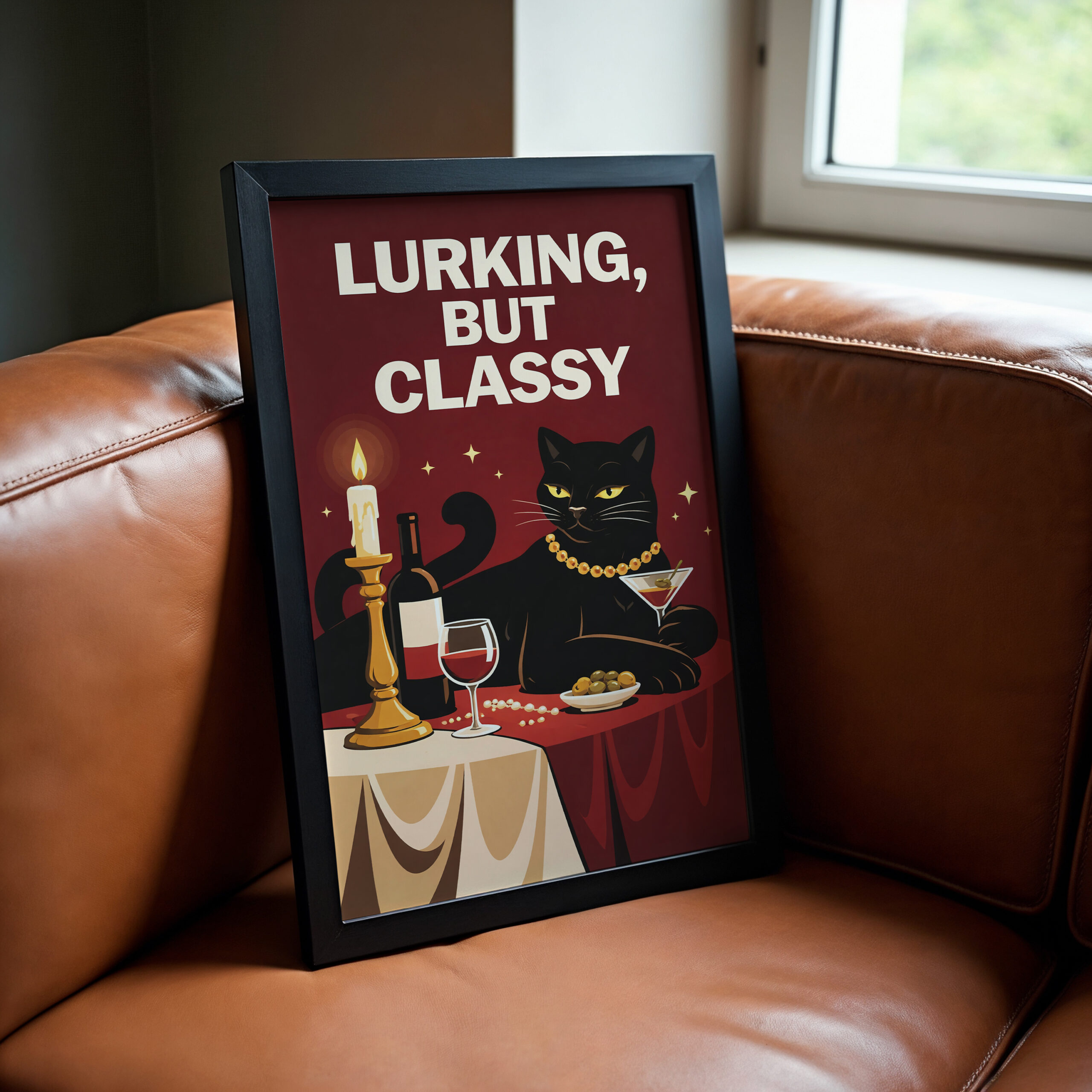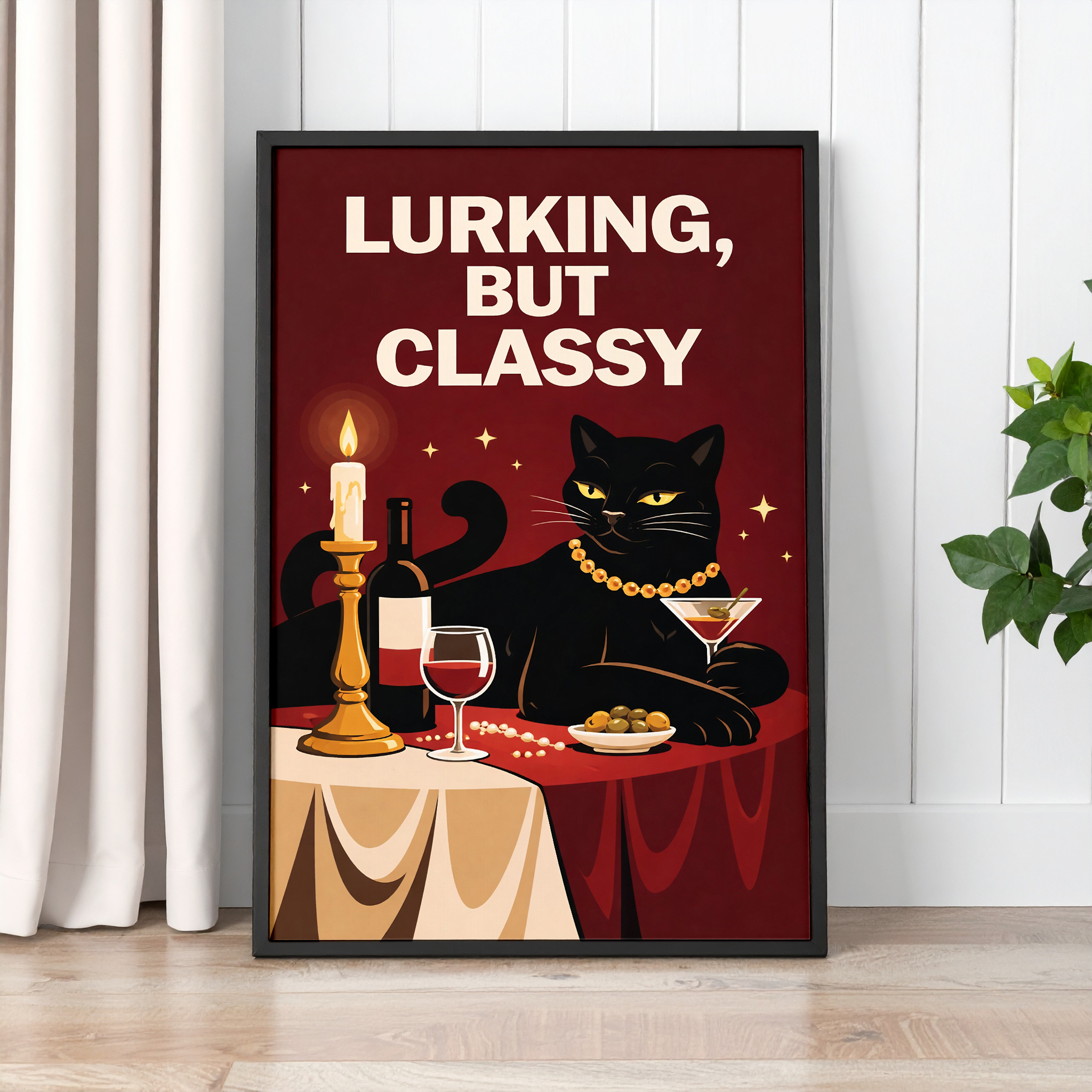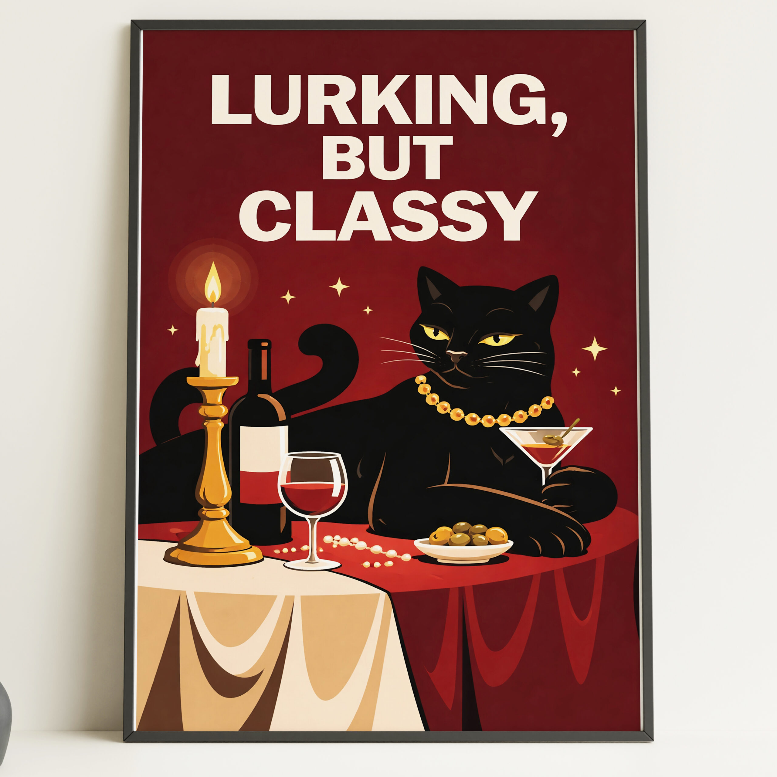 Add humour and style to your space with this Lurking But Classy black cat wall art print. Featuring a black cat dressed in pearls at a candlelit table with wine, this playful artwork mixes retro charm with a bold, witty feel that makes it instantly eye-catching. The deep red background, simple composition, and strong character make this print ideal for anyone who loves quirky animal art and statement decor with personality.