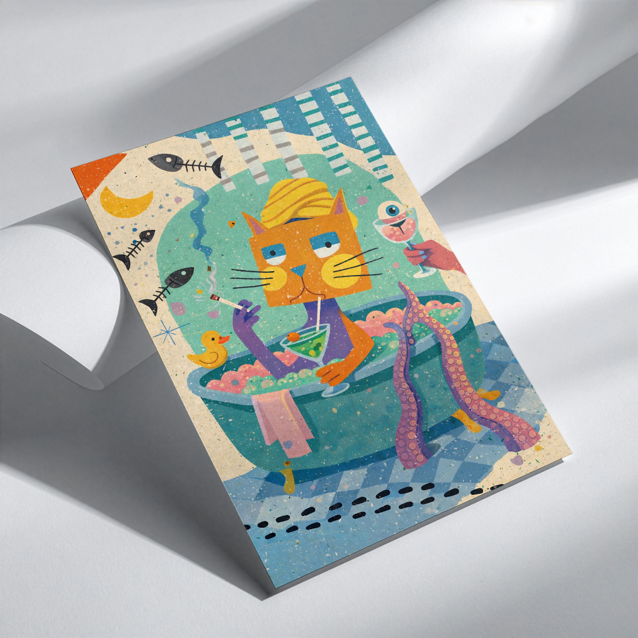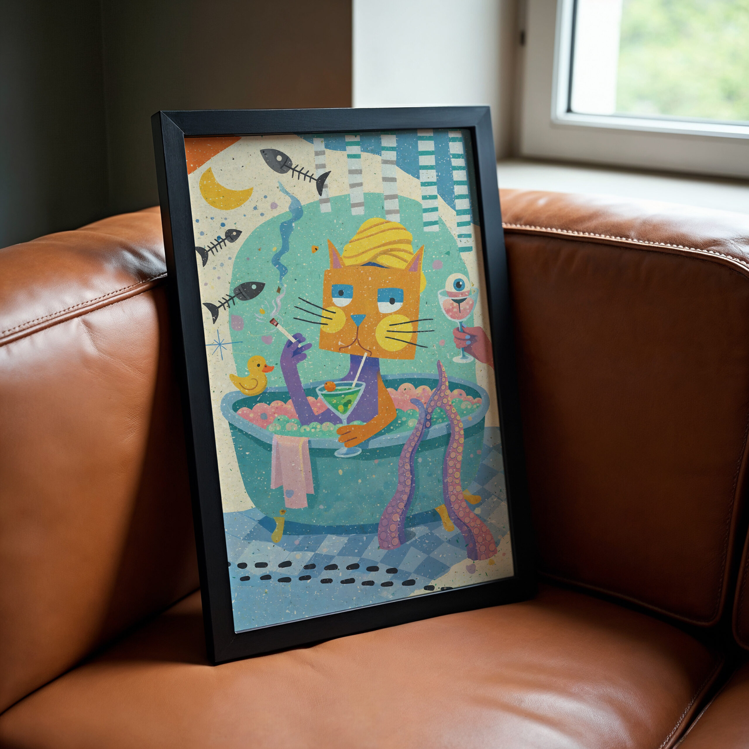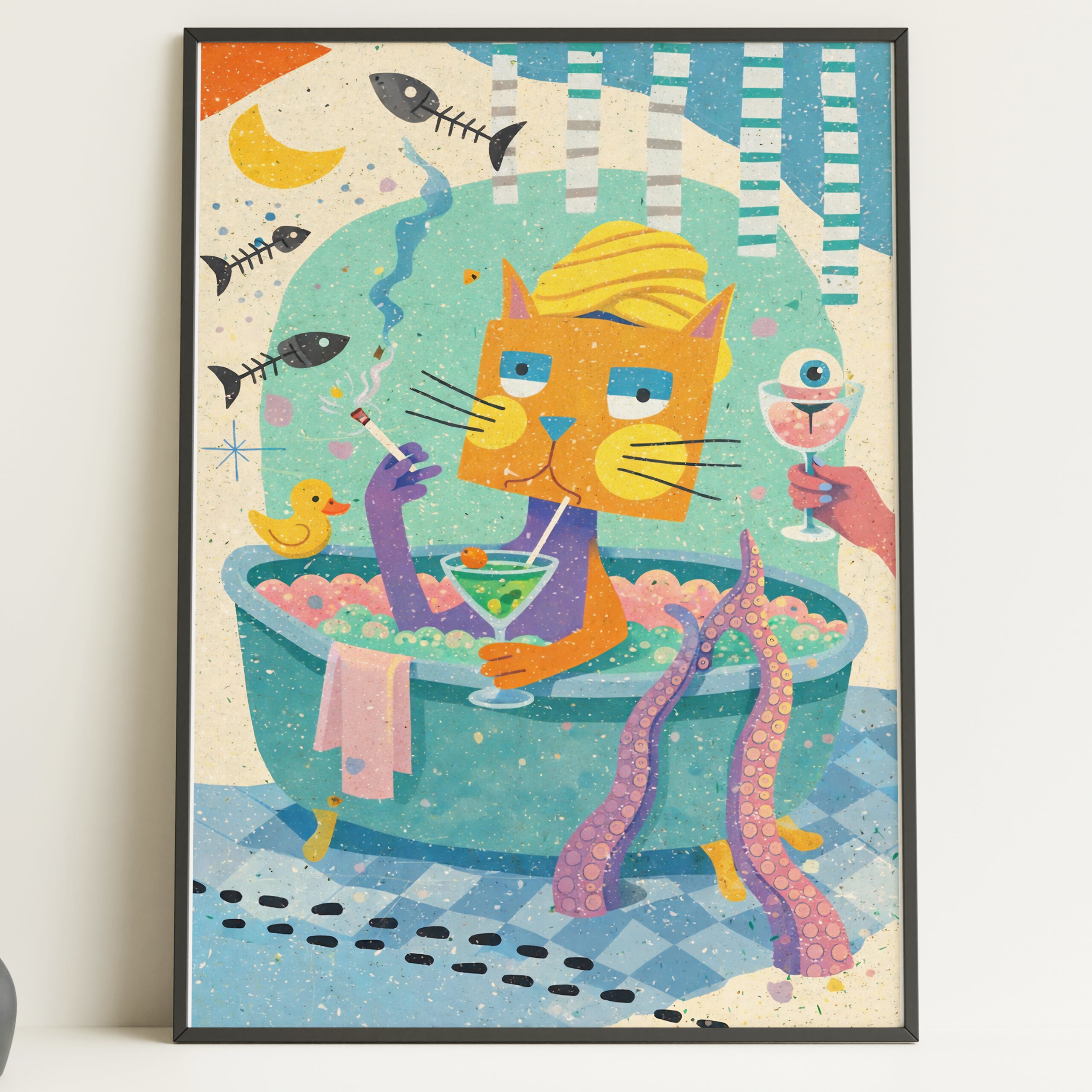 Funny smoking cat bath wall art print with bright colours and quirky detail. A playful bathroom decor poster for cat lovers and bold home interiors.
