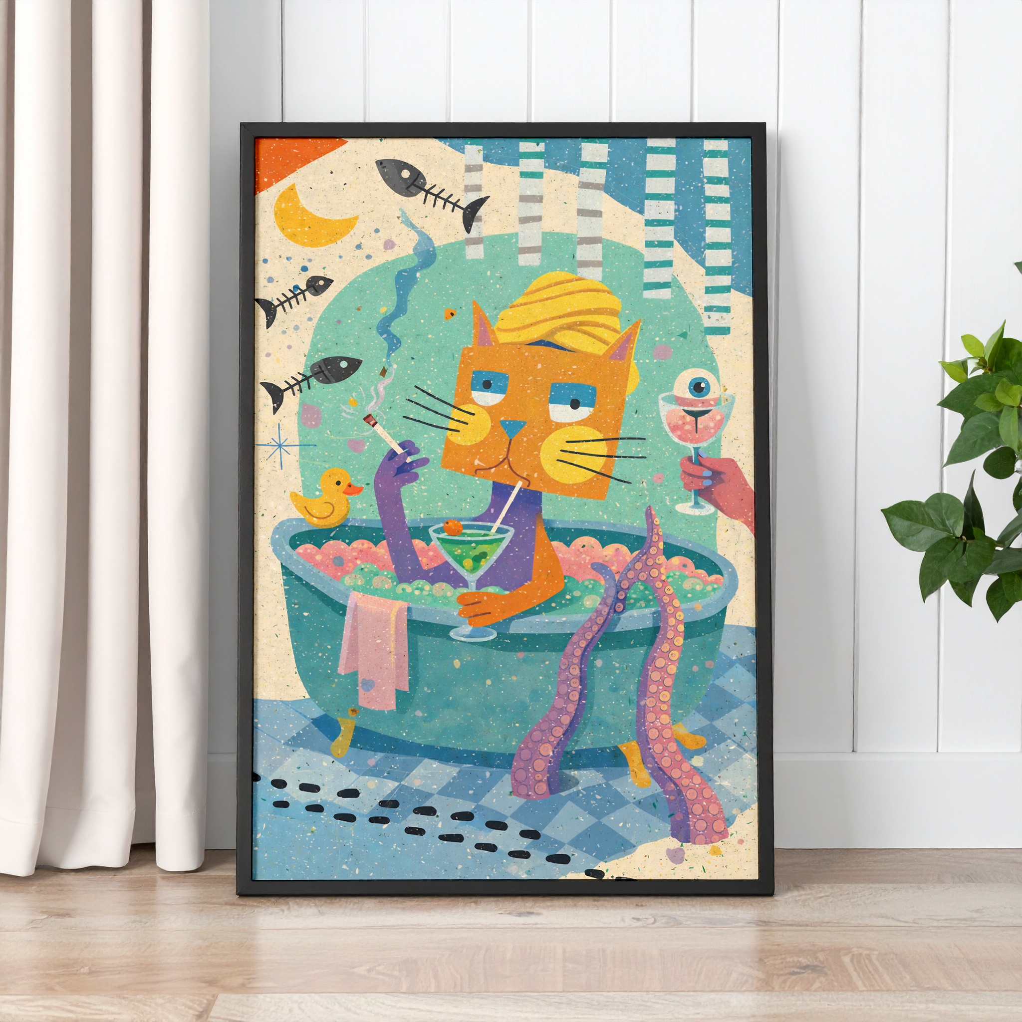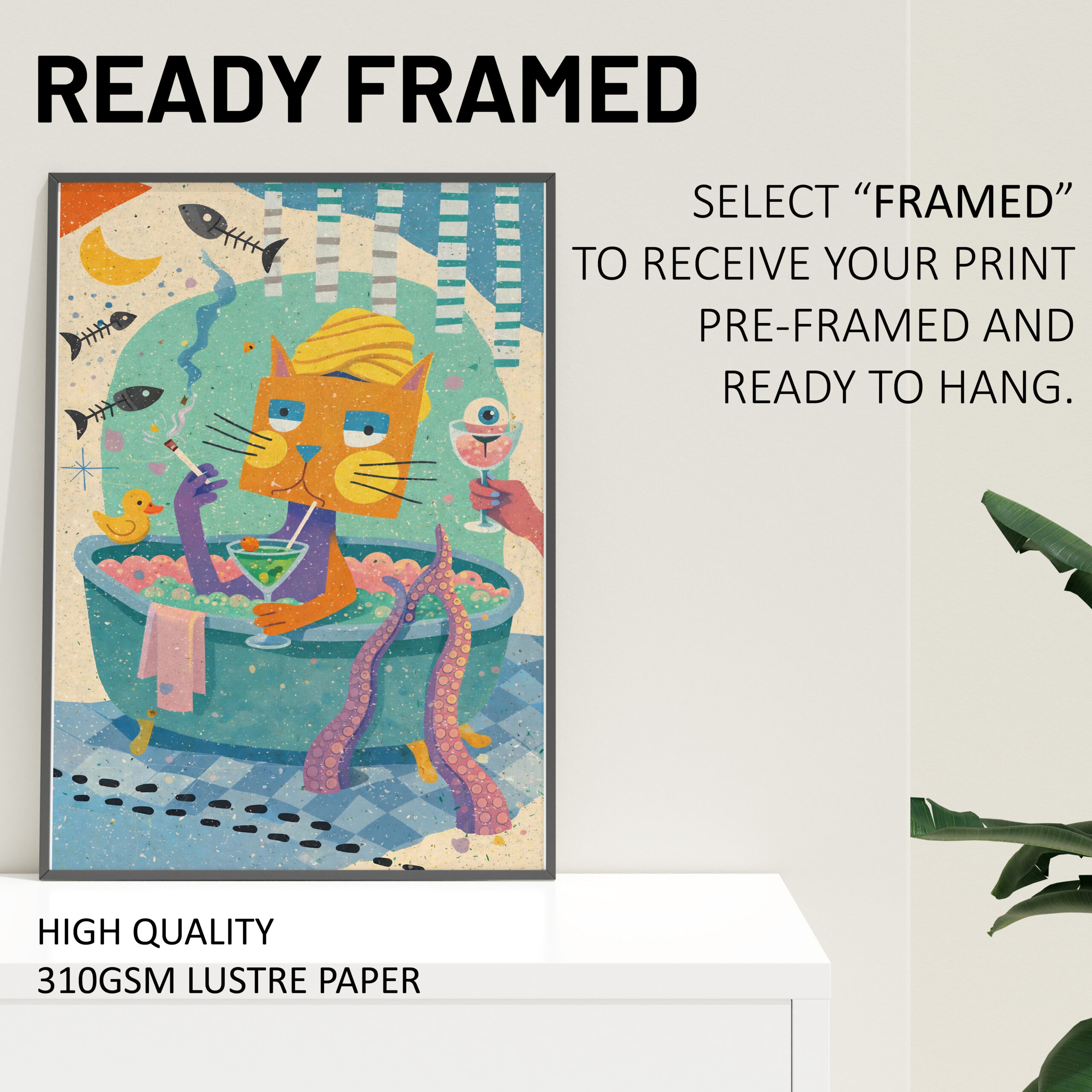The bold composition and lively colour palette make this print a great choice for bathrooms, cloakrooms, guest toilets, or eclectic home spaces that need a fun focal point. It has a light-hearted, slightly surreal style that works well in modern homes, colourful interiors, and spaces that lean into unusual wall art with a sense of humour. This poster is especially suited to people who love funny animal prints, quirky cat artwork, and bathroom wall decor that stands out from the usual.