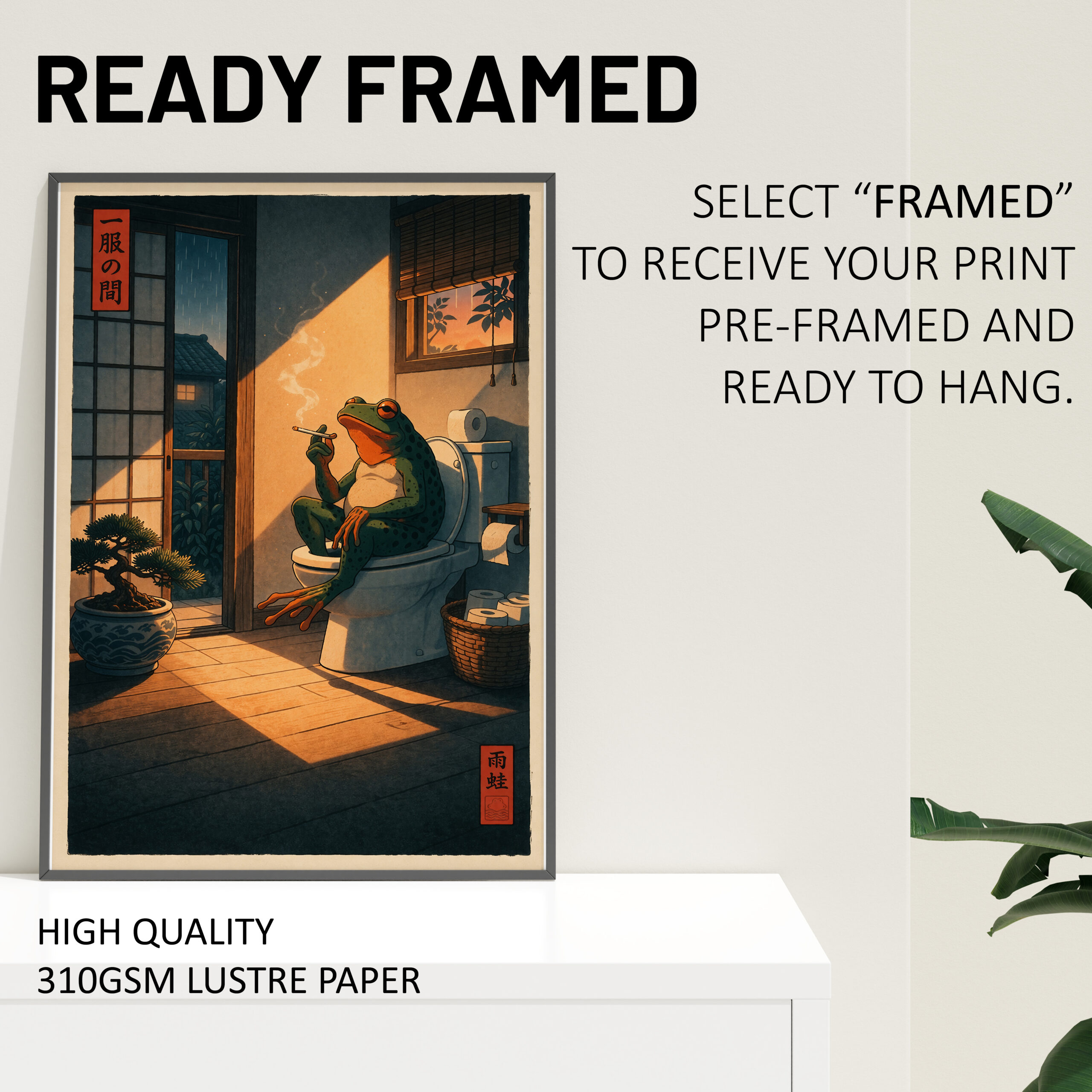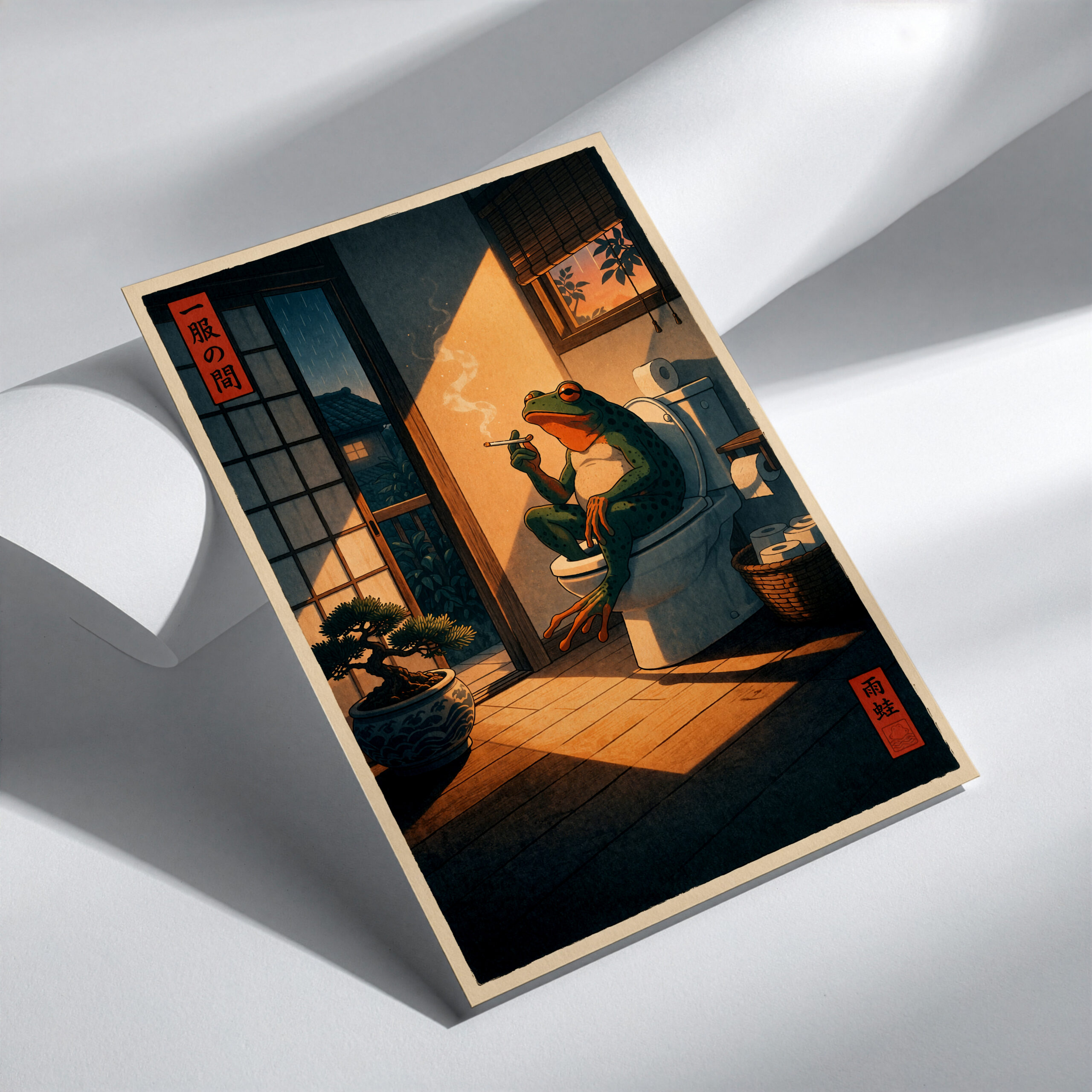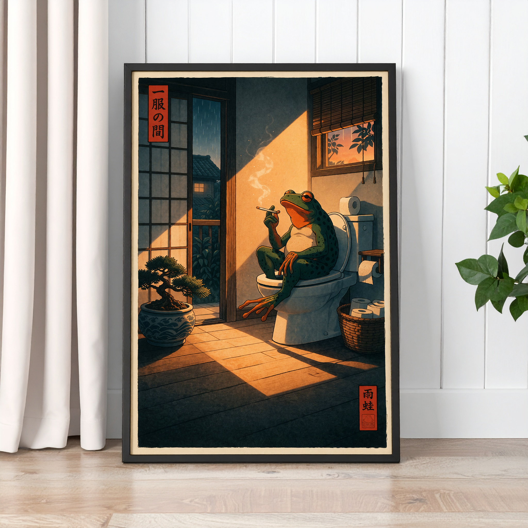 Add something unexpected to your walls with this Smoking Frog Japanese wall art print, a bold and unusual design full of mood and character. Featuring a frog seated indoors in a traditional Japanese-inspired setting, this artwork blends playful animal imagery with a calm, cinematic atmosphere that instantly catches attention.