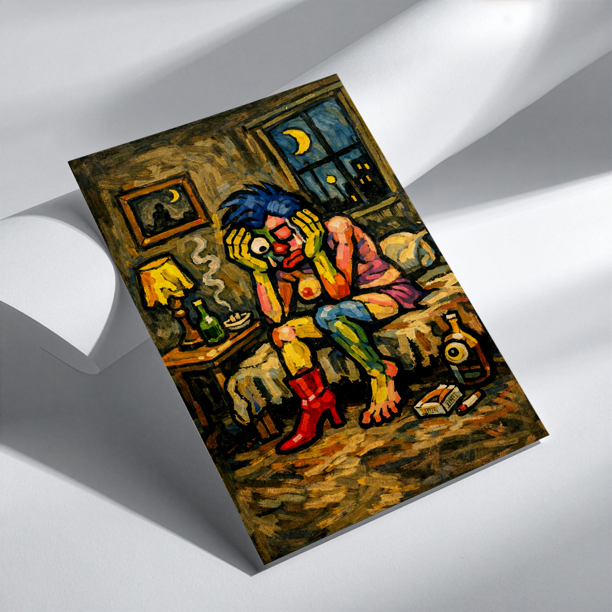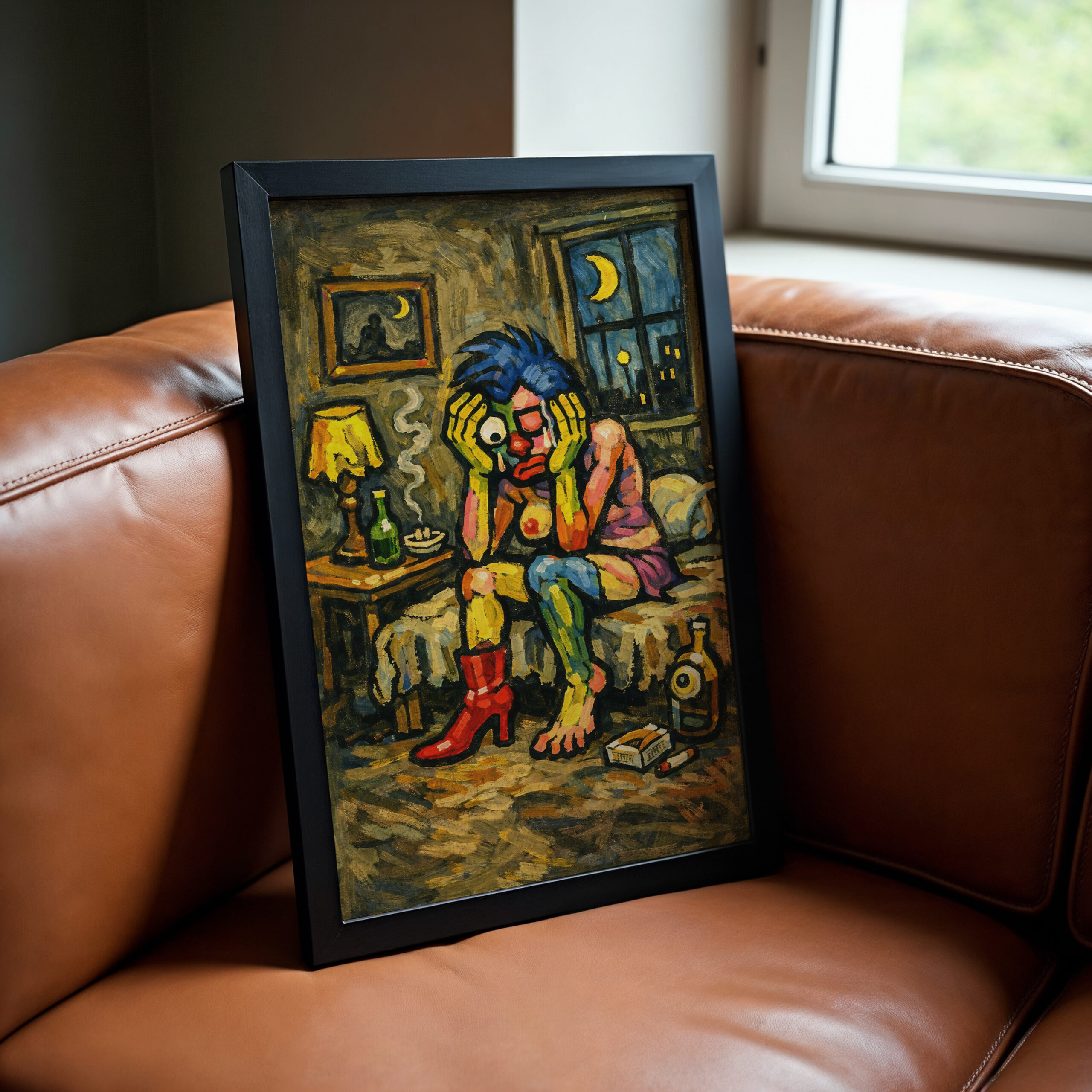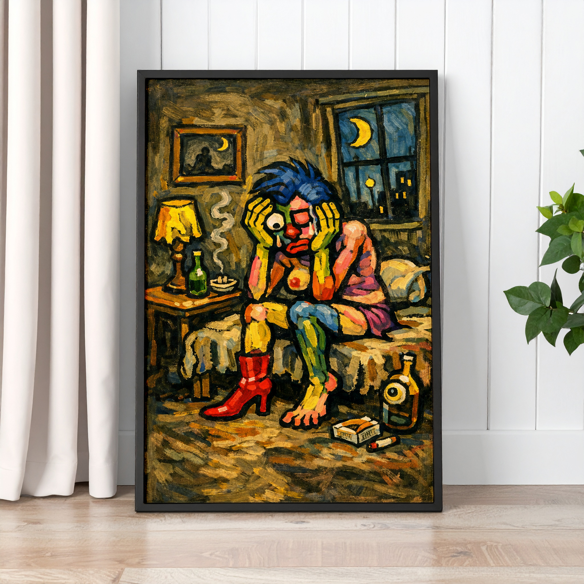 Add mood, solitude, and strange character to your home with The Lonely Monster wall art print. Featuring a surreal figure sitting alone in a dimly lit room with bright blue hair, red boots, and a cigarette in hand, this artwork creates a raw and emotional scene that feels both unsettling and oddly familiar. The textured painted style, late-night interior, and exaggerated features give the print a bold expressive look that instantly stands out on the wall.