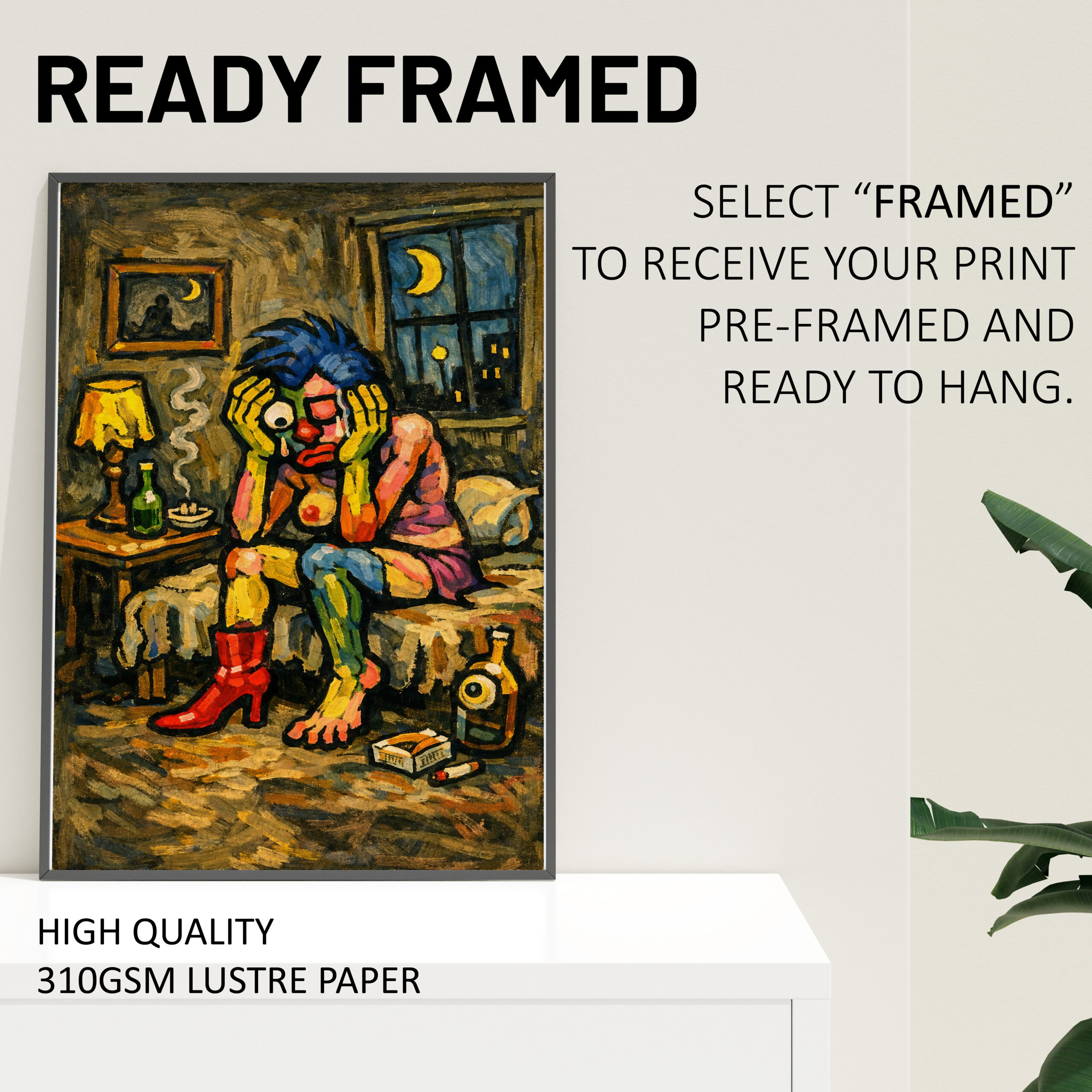 This piece is ideal for anyone who loves surreal wall art, weird character prints, monster posters, or unusual decor with a more emotional and introspective feel. It works especially well in bedrooms, studios, games rooms, home bars, offices, or creative spaces where you want to add something bold, strange, and full of atmosphere. The lonely pose and moody setting give the artwork a dramatic presence while still keeping the playful unhinged energy of the collection.