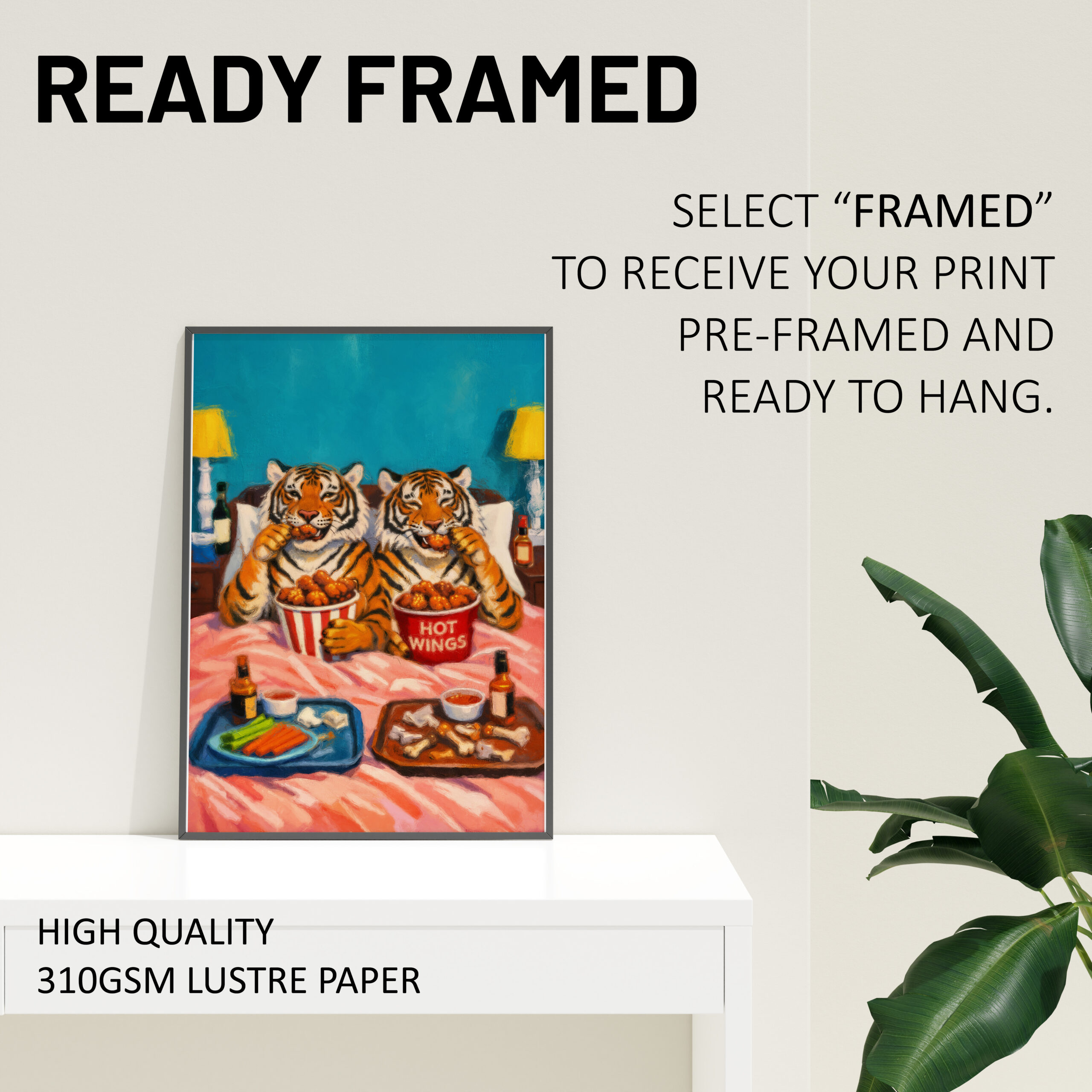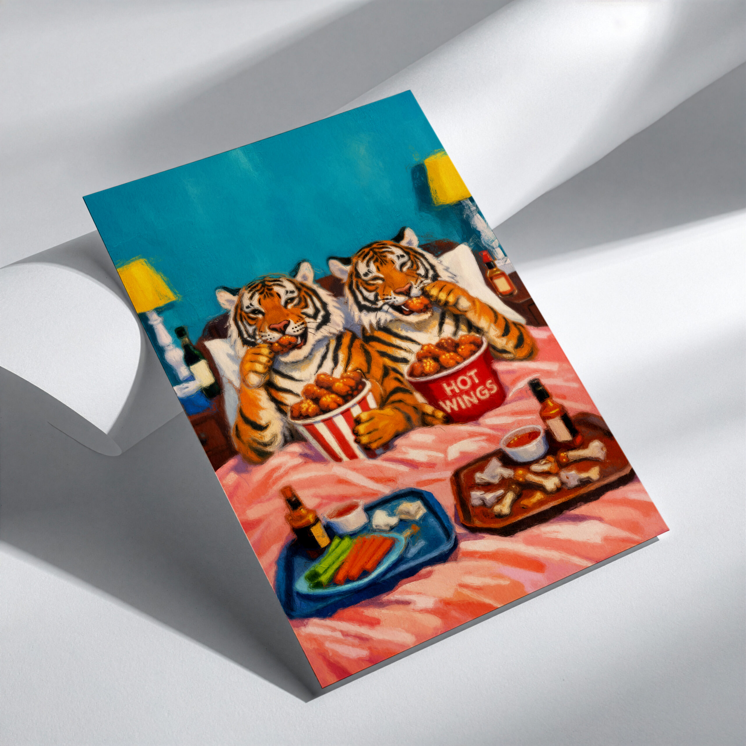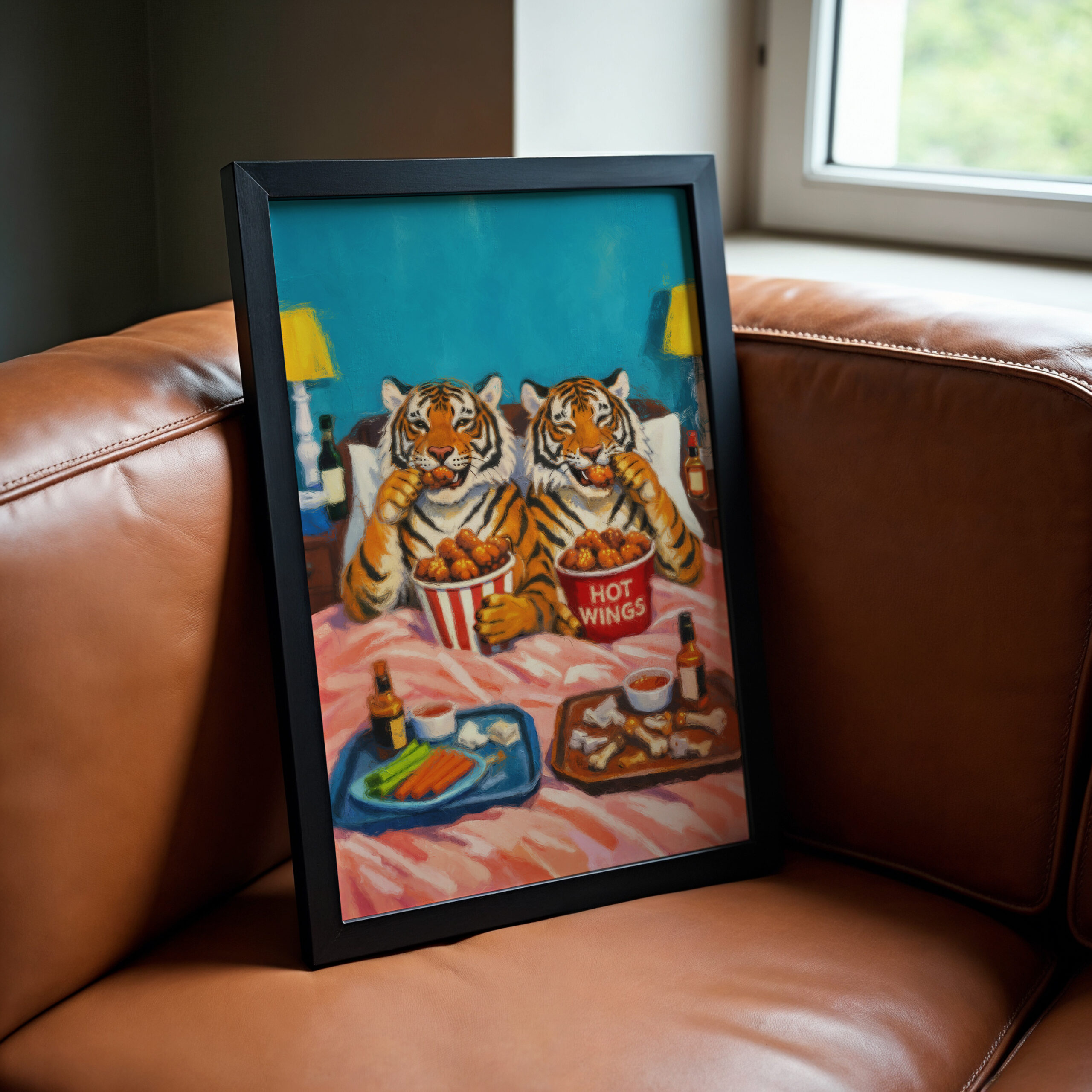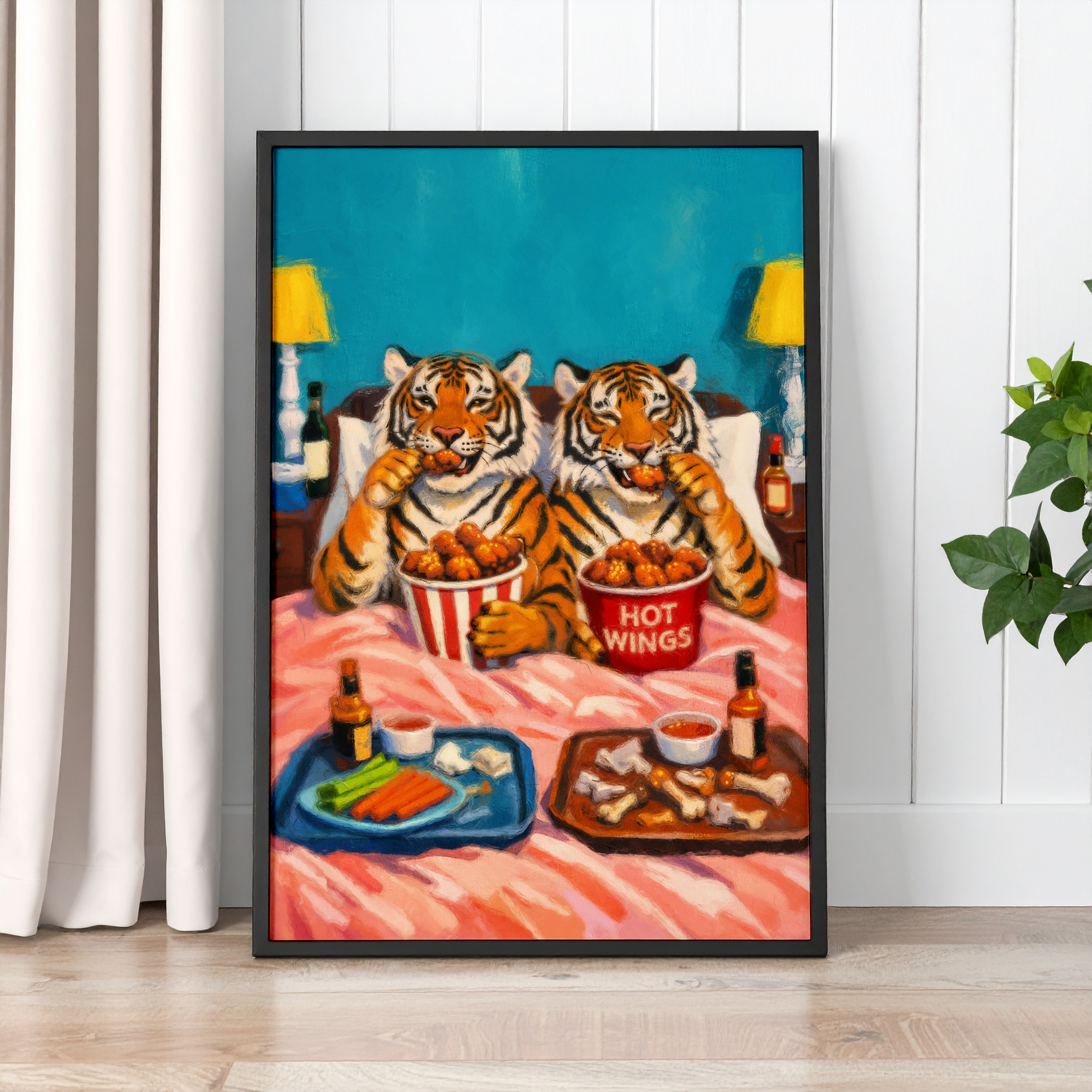 Bring humour and colour into your space with this bold Tiger Hot Wings wall art print. Featuring two tigers tucked up in bed enjoying a tray of hot wings, this playful artwork is full of character and perfect for anyone who loves quirky animal art, fun food prints, and statement home decor.