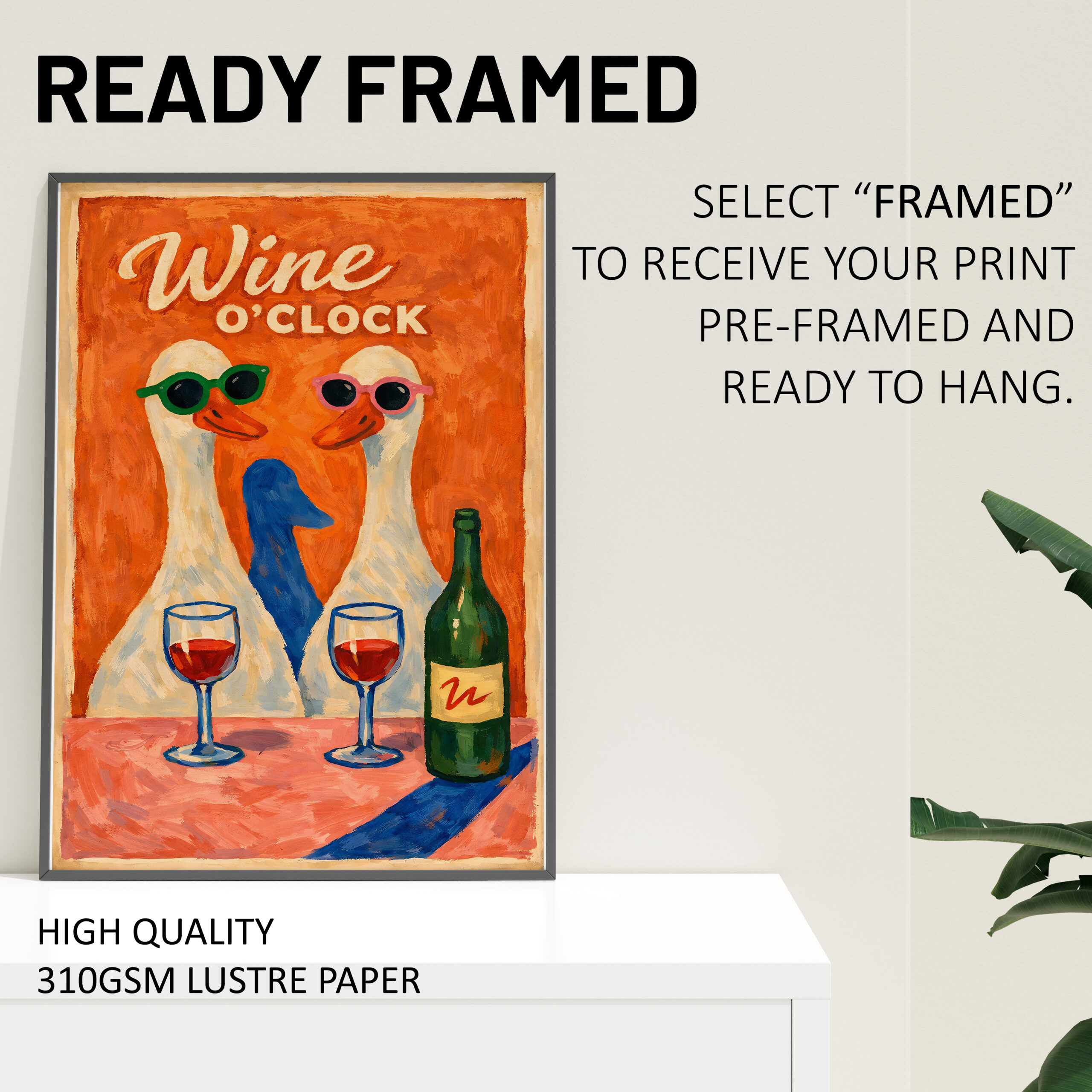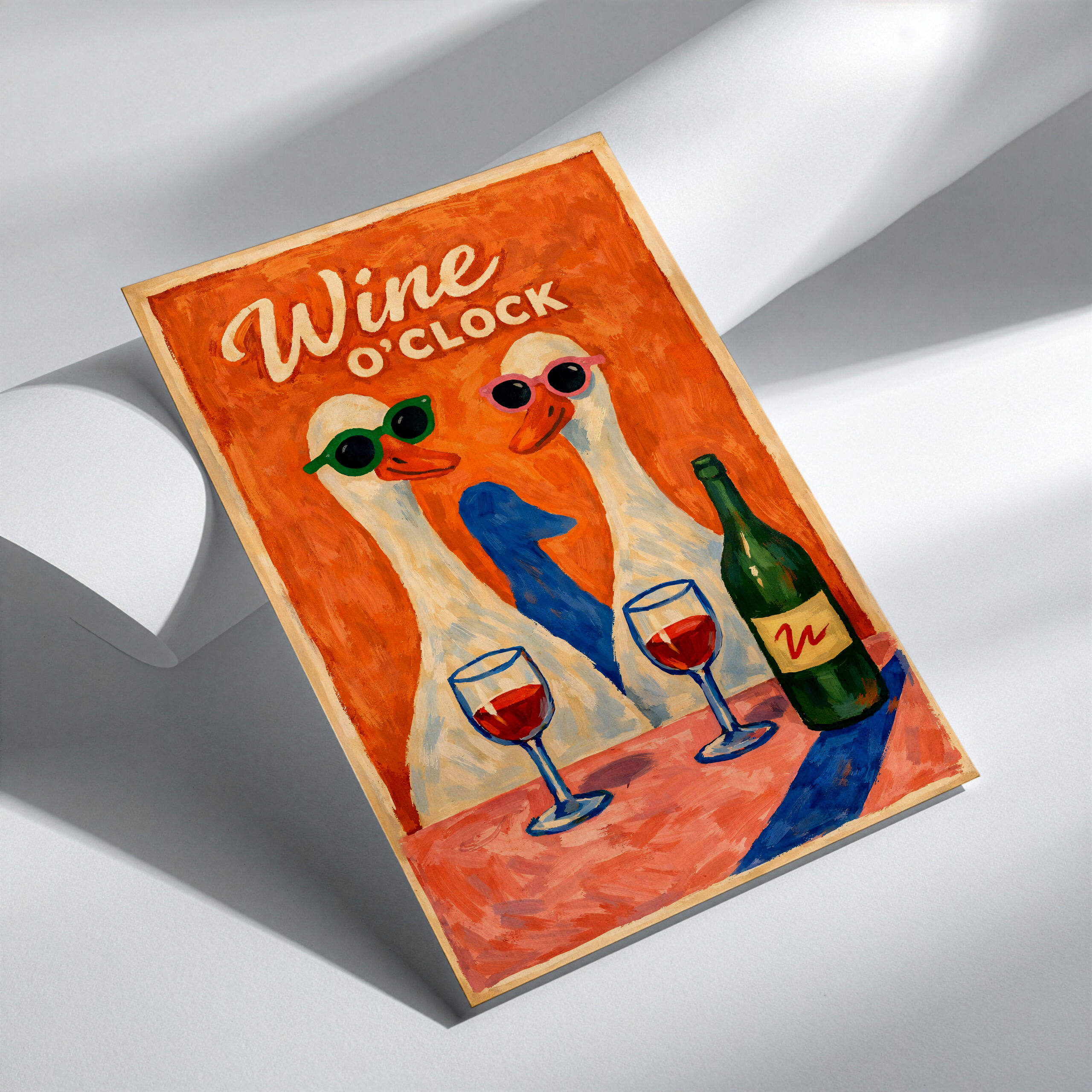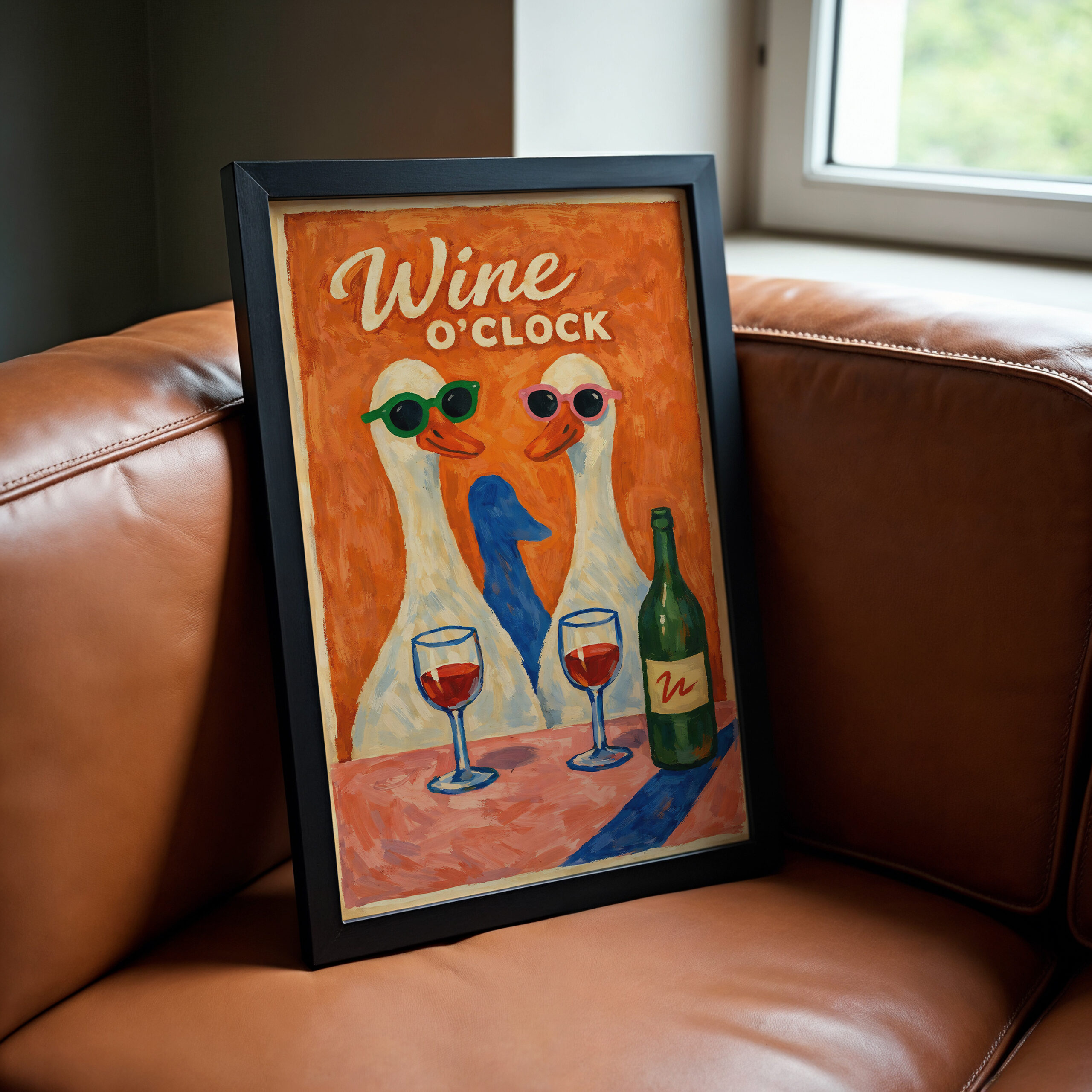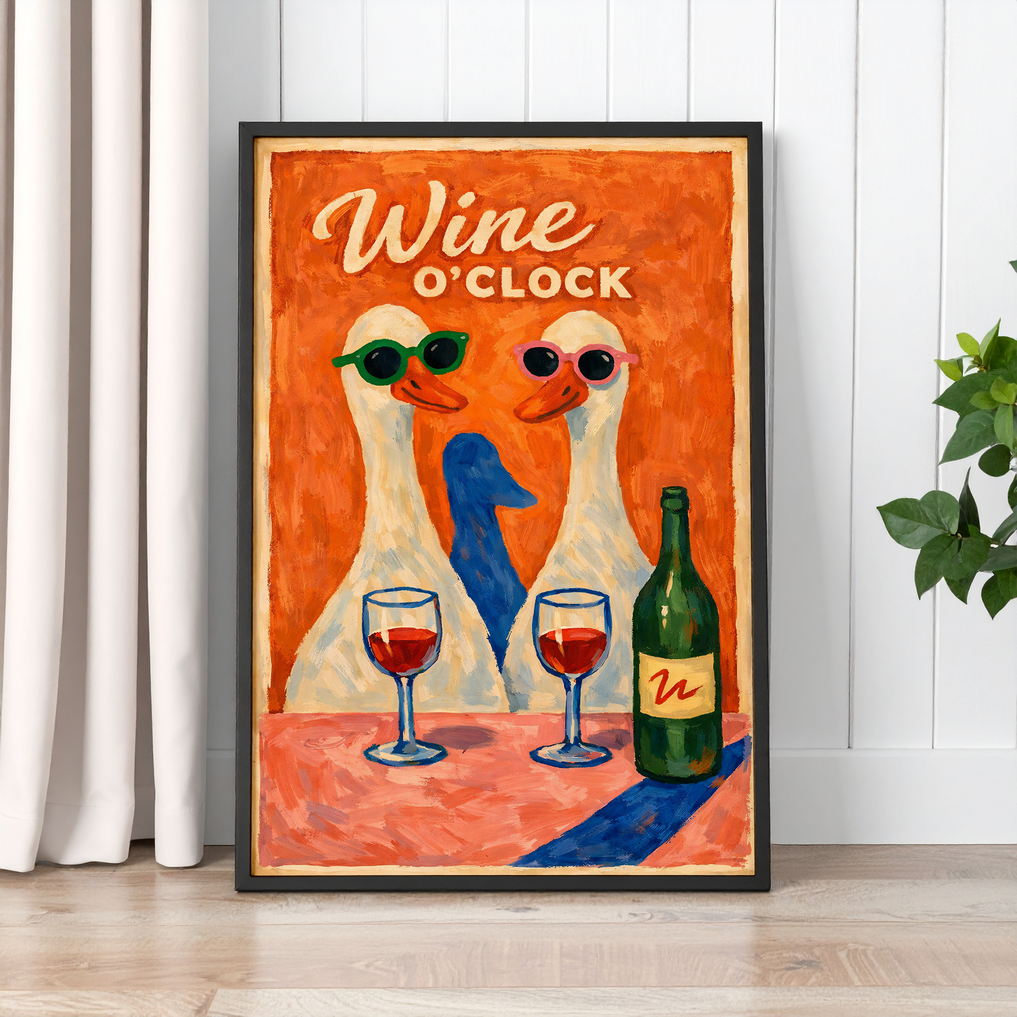 Add a fun and stylish touch to your home with this Wine O’Clock Duck wall art print. Featuring two ducks in sunglasses enjoying glasses of wine against a warm orange background, this artwork is full of charm, colour, and playful personality. It is a perfect choice for anyone who loves quirky wall art, funny animal prints, and light-hearted decor with a bold visual look.